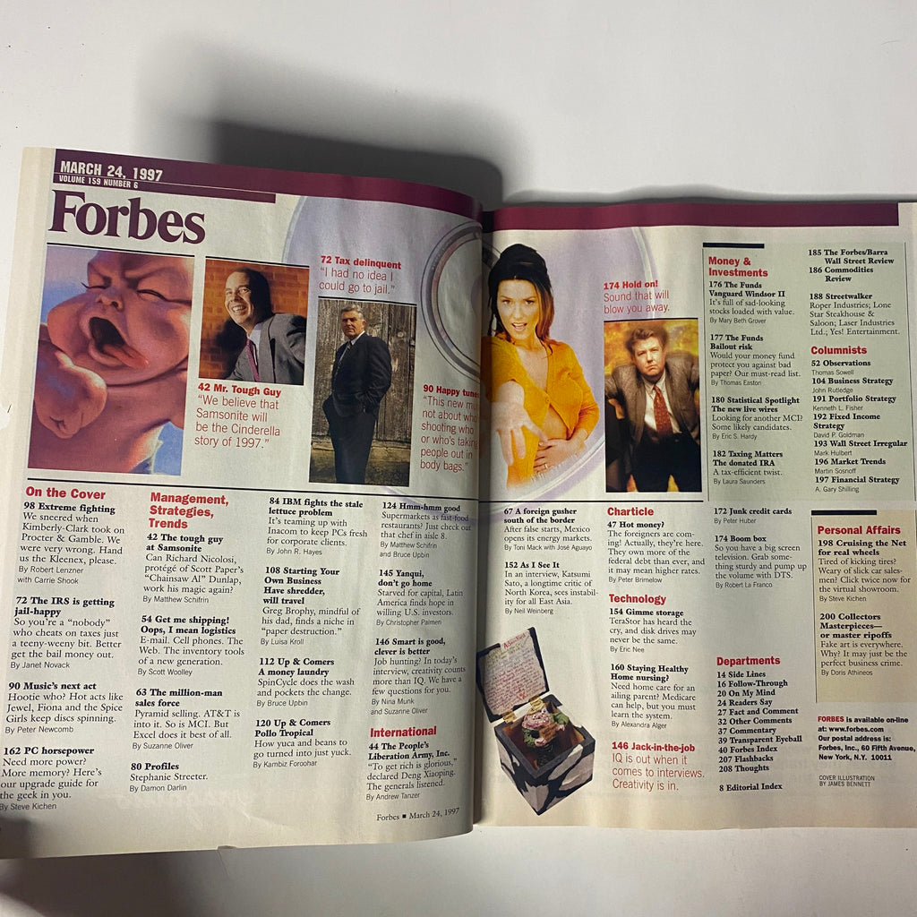 This vintage issue of Forbes magazine, dated March 24, 1997 (Volume 159, Number 6), is in good condition, with noted water damage. The item pictured in this listing is exactly the same one you will receive. Please check the photos for condition purposes. We offer combined shipping upon request, and every item comes with a plastic protective covering for preservation.