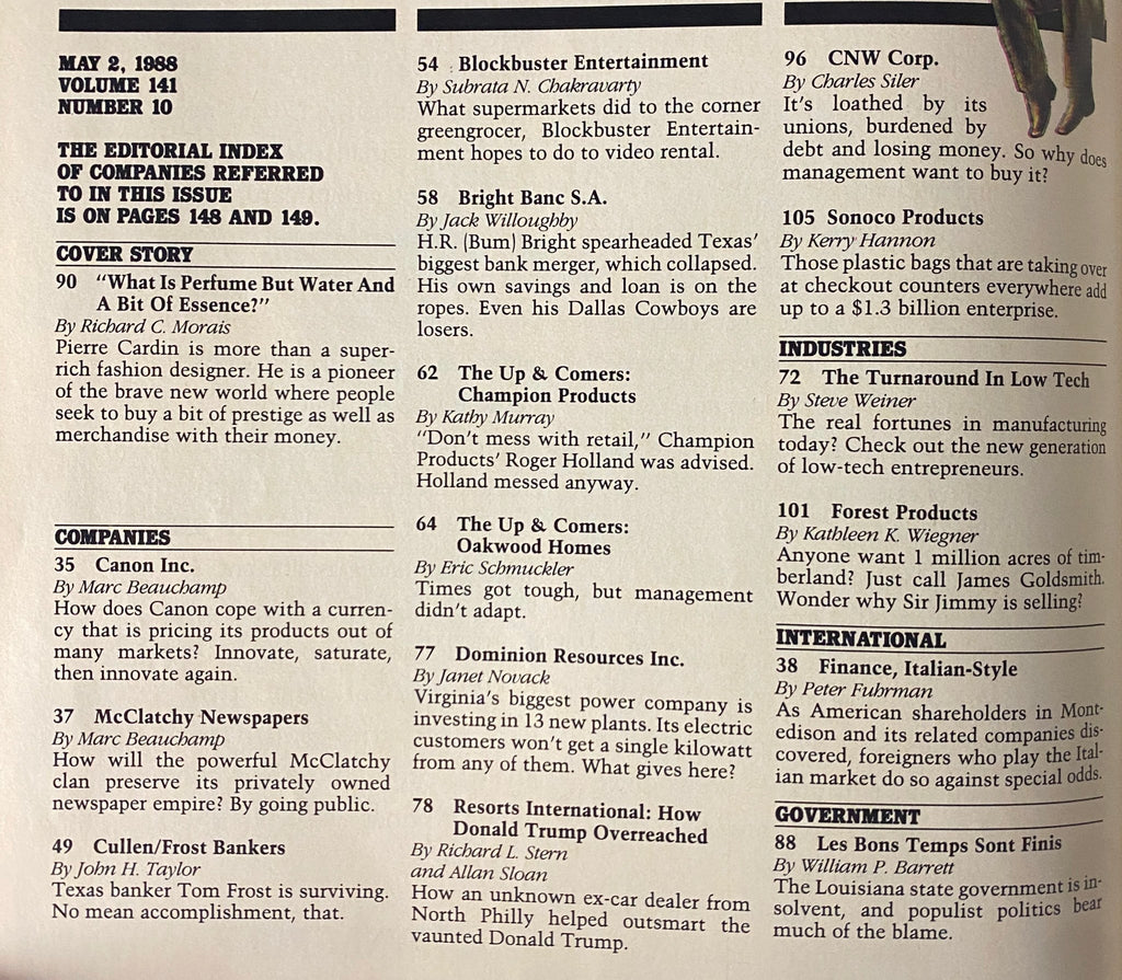 Step into the realm of historic media with this Forbes Magazine vintage issue from May 2, 1988, featuring the iconic designer-businessman Pierre Cardin on the cover. This significant edition offers a captivating insight into Cardin's visionary approach to luxury branding, highlighting the intersection of fashion and commerce during a transformative decade.