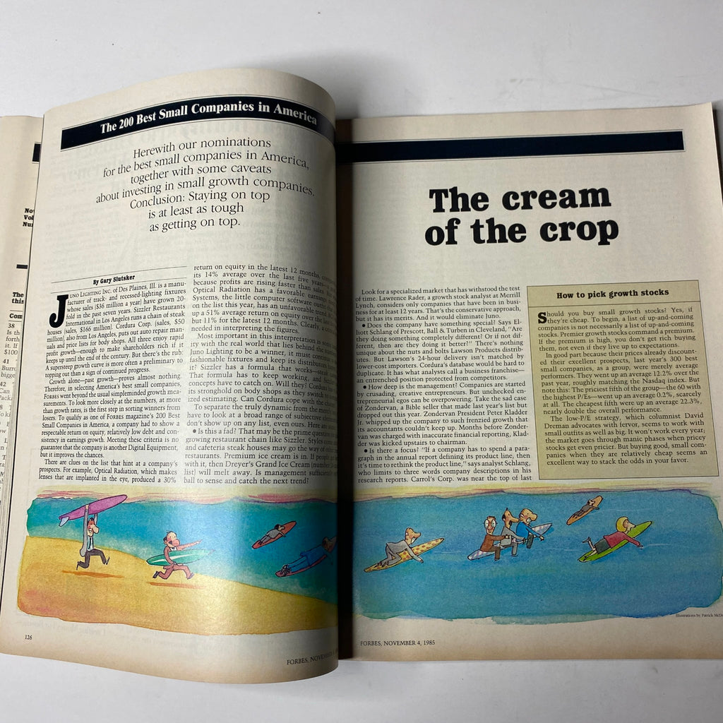 Experience a piece of business history with the Forbes Magazine, dated November 4, 1985. This unique vintage issue showcases the extensive feature, The 200 Best Small Companies in America, which highlights some of the most innovative and resilient businesses in the nation during a time of economic transition.