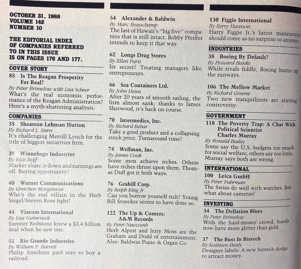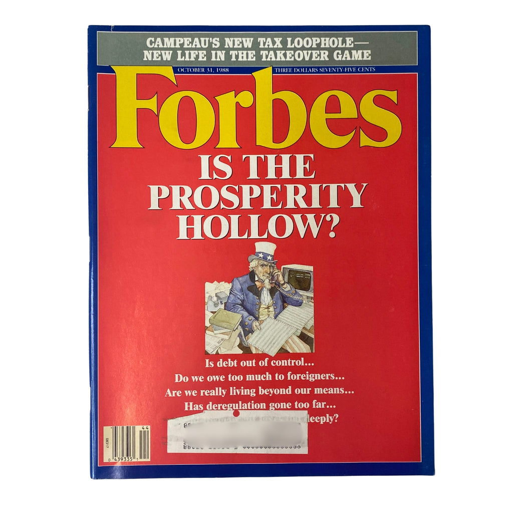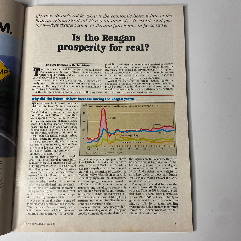 This vintage issue of Forbes Magazine from October 31, 1988, presents a critical analysis titled "Is The Reagan Prosperity For Real?" This fascinating edition explores the economic legacy of the Reagan Administration, questioning whether the prosperity of the 1980s was based on solid growth or merely a speculative bubble.