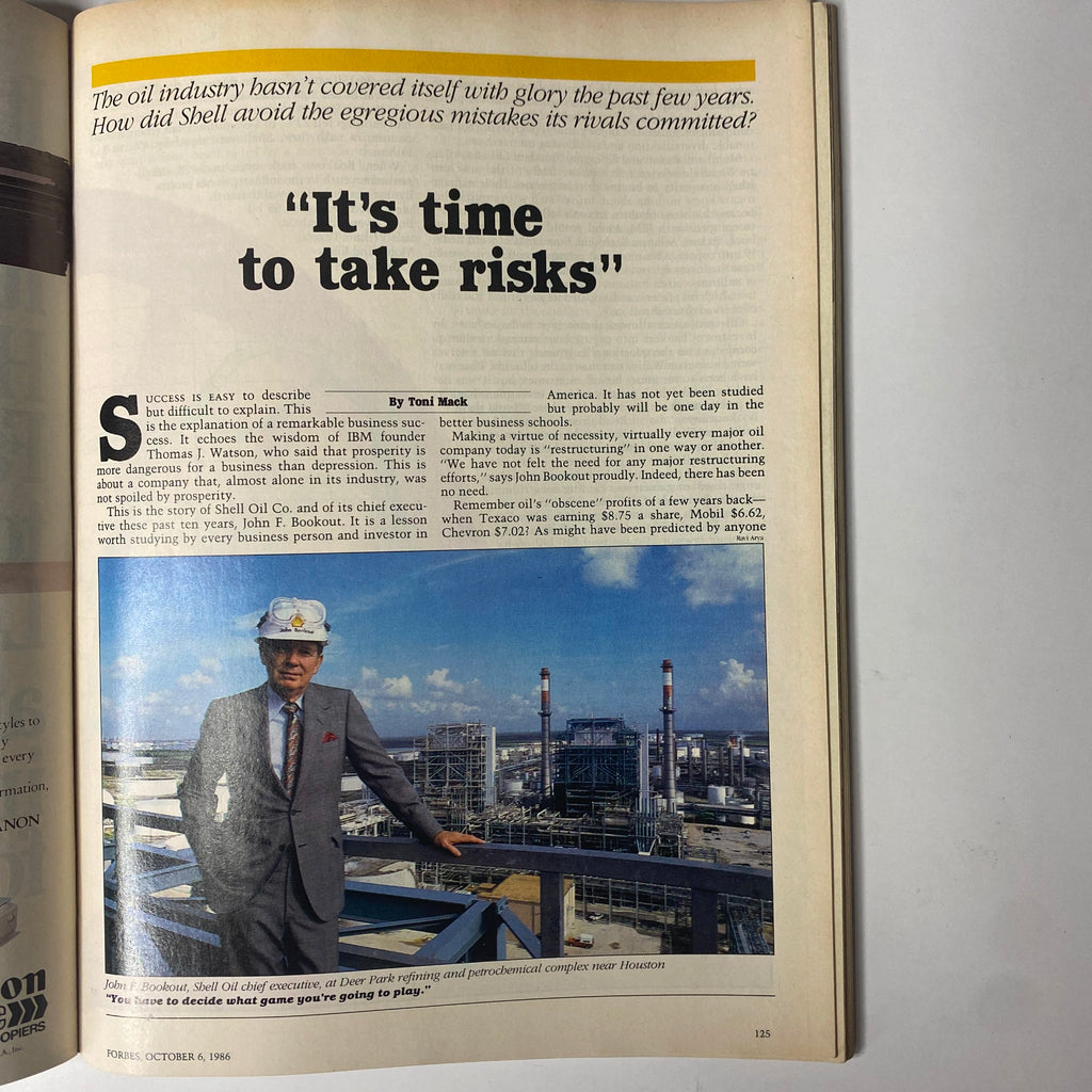 This vintage issue of Forbes Magazine from October 6, 1986, is a remarkable collectible that dives deep into the world of corporate leadership, specifically highlighting the impressive tenure of John F. Bookout at Shell Oil. This issue is particularly significant as it offers insights into how Shell Oil skillfully navigated the significant economic downturns that put many of its competitors in dire straits. Collectors and enthusiasts of vintage magazines will find immense value in this issue, as it provides a unique perspective on the dynamics of the energy sector during a pivotal time.