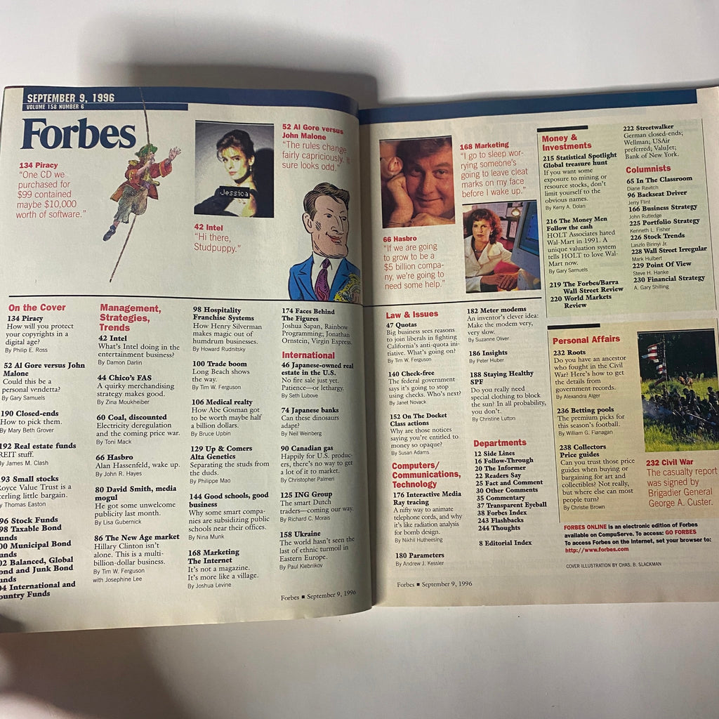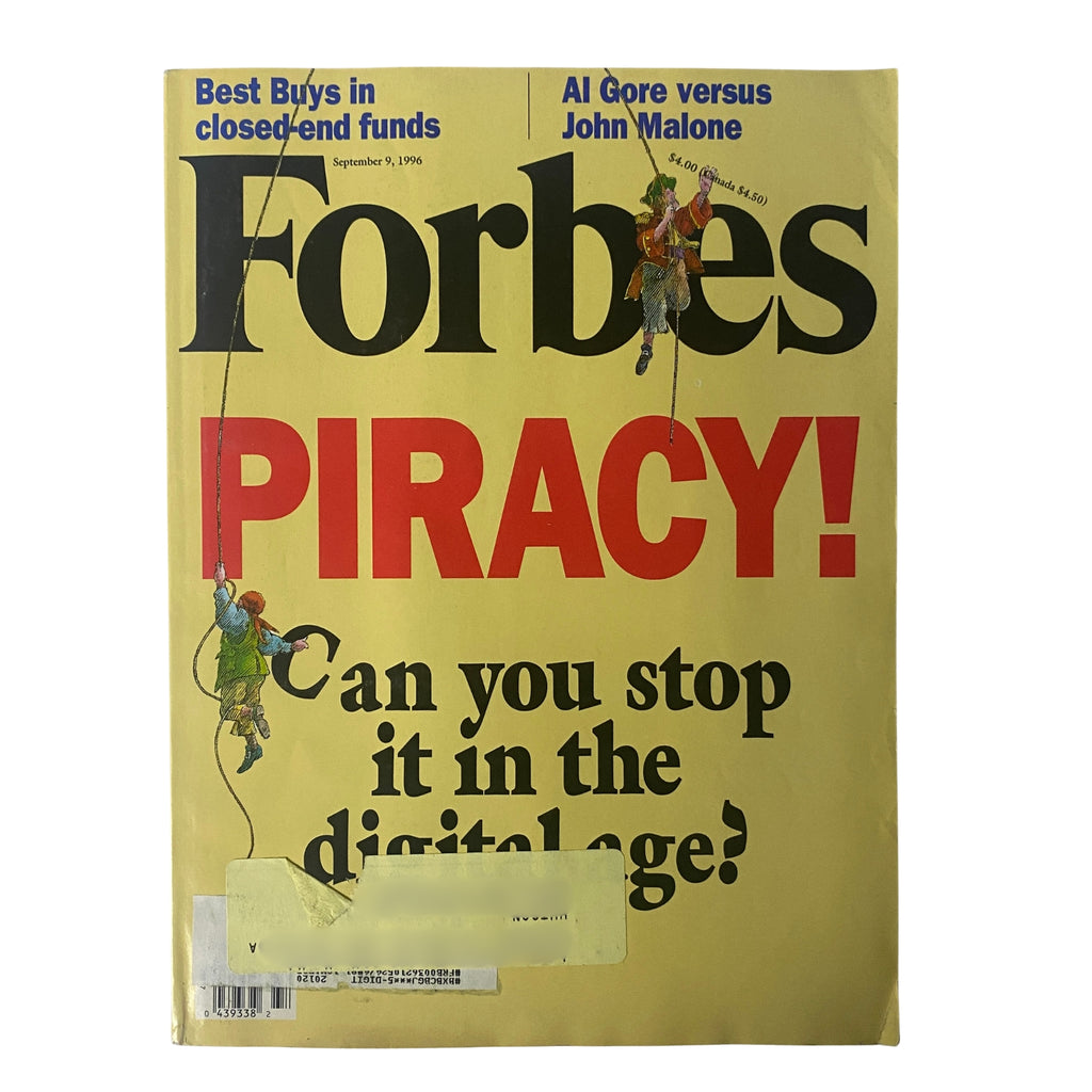 This September 9, 1996 issue of Forbes features the cover story “Piracy: Protecting Copyright in a Digital Age” and includes a major article, “Al Gore versus John Malone: Could This Be a Personal Vendetta?” by Gary Samuels. Other highlights include in-depth reporting on real estate funds, small stocks, Intel’s foray into entertainment, and the booming New Age market.