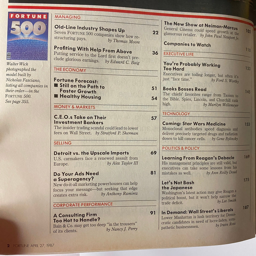 This issue not only lists the largest corporations, but it also features insightful articles that explore significant events such as Wall Street’s insider trading scandal and the resurgence of Detroit’s automotive industry amidst fierce European competition. These stories reflect a pivotal moment in corporate America and offer readers a unique perspective on the challenges and triumphs that businesses faced during that era.