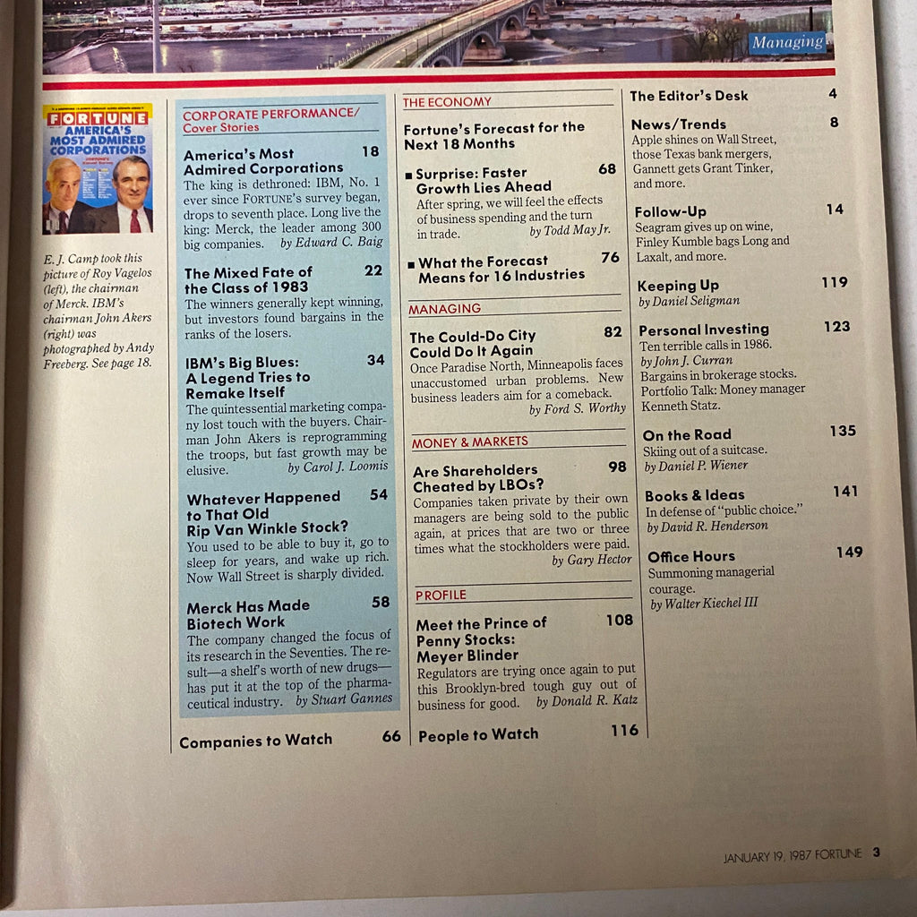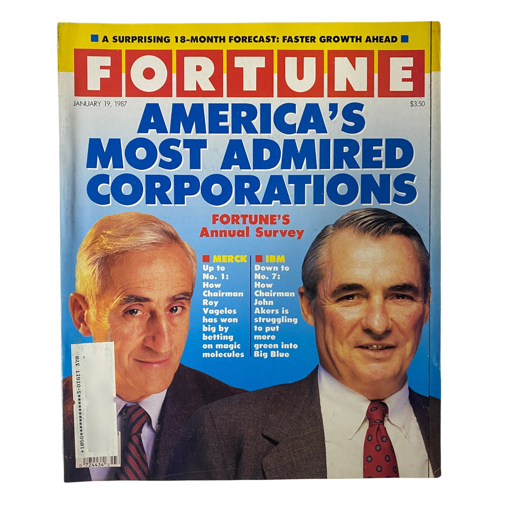This vintage magazine issue of Fortune Magazine from January 19, 1987, is a remarkable and collectible piece of history, perfect for enthusiasts of vintage magazines and corporate culture. In this issue, notable contributors Roy Vagelos and John Akers are showcased, pivoting the spotlight on evolving corporate performances and industry leadership that defined the late 1980s.