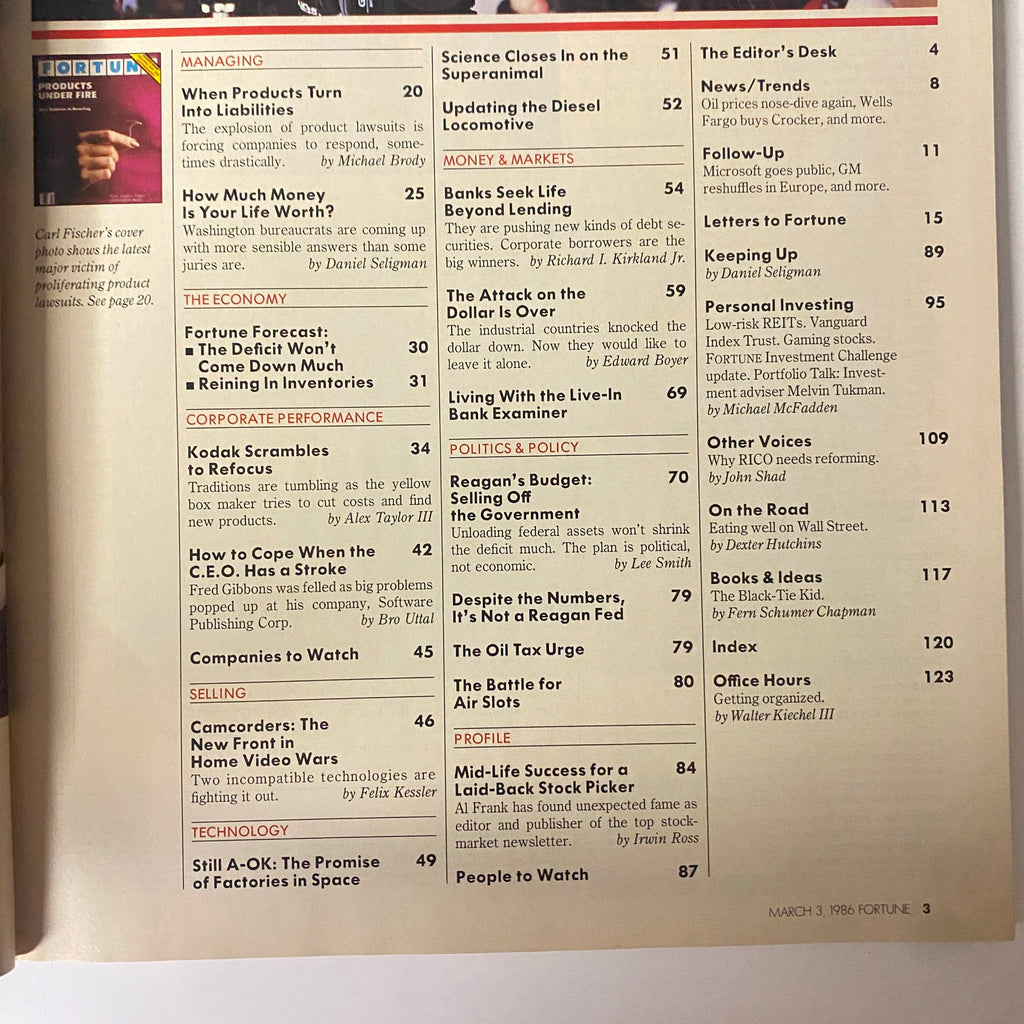 Discover a fascinating piece of history with this Fortune Magazine March 3, 1986 vintage issue. This collectible magazine showcases an in-depth exploration of G.D. Searle's Copper 7 contraceptive device, delving into the complex legal and financial implications surrounding product liability at a pivotal moment in American history.