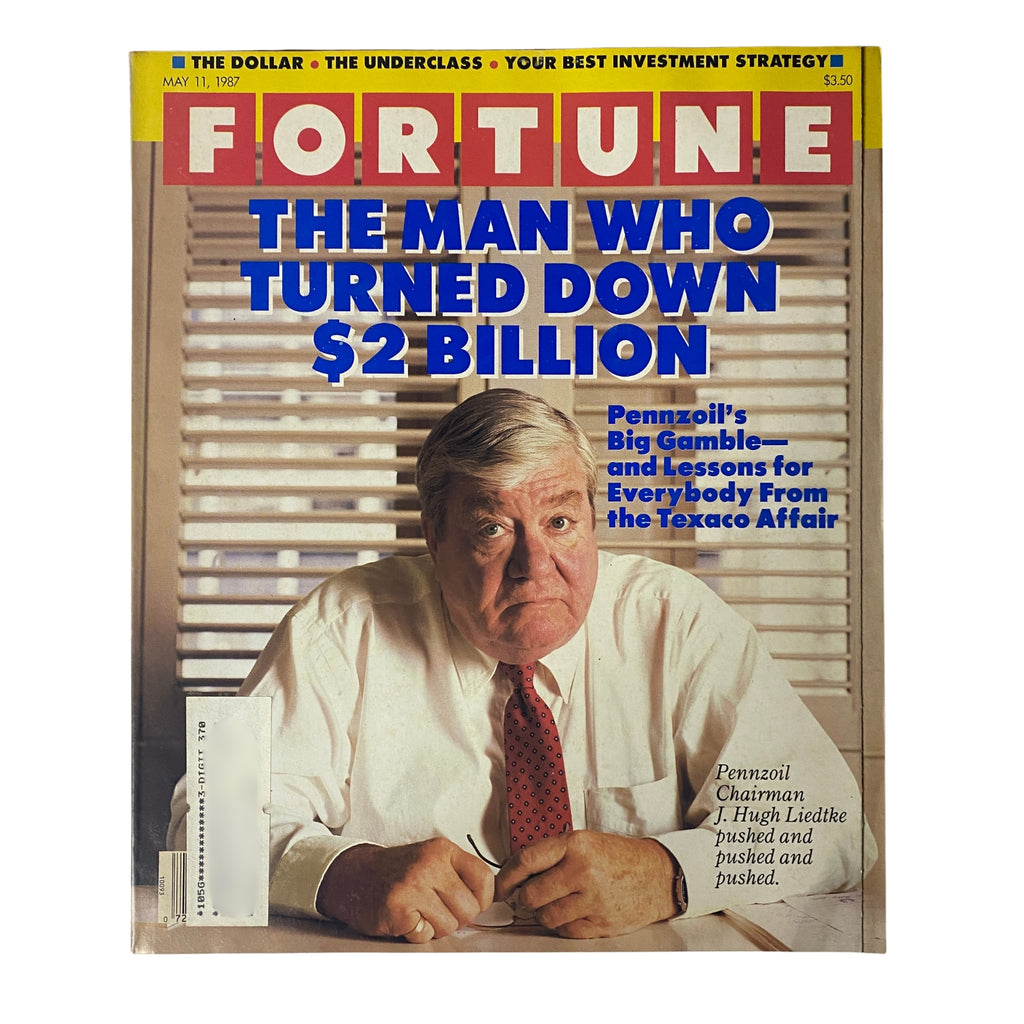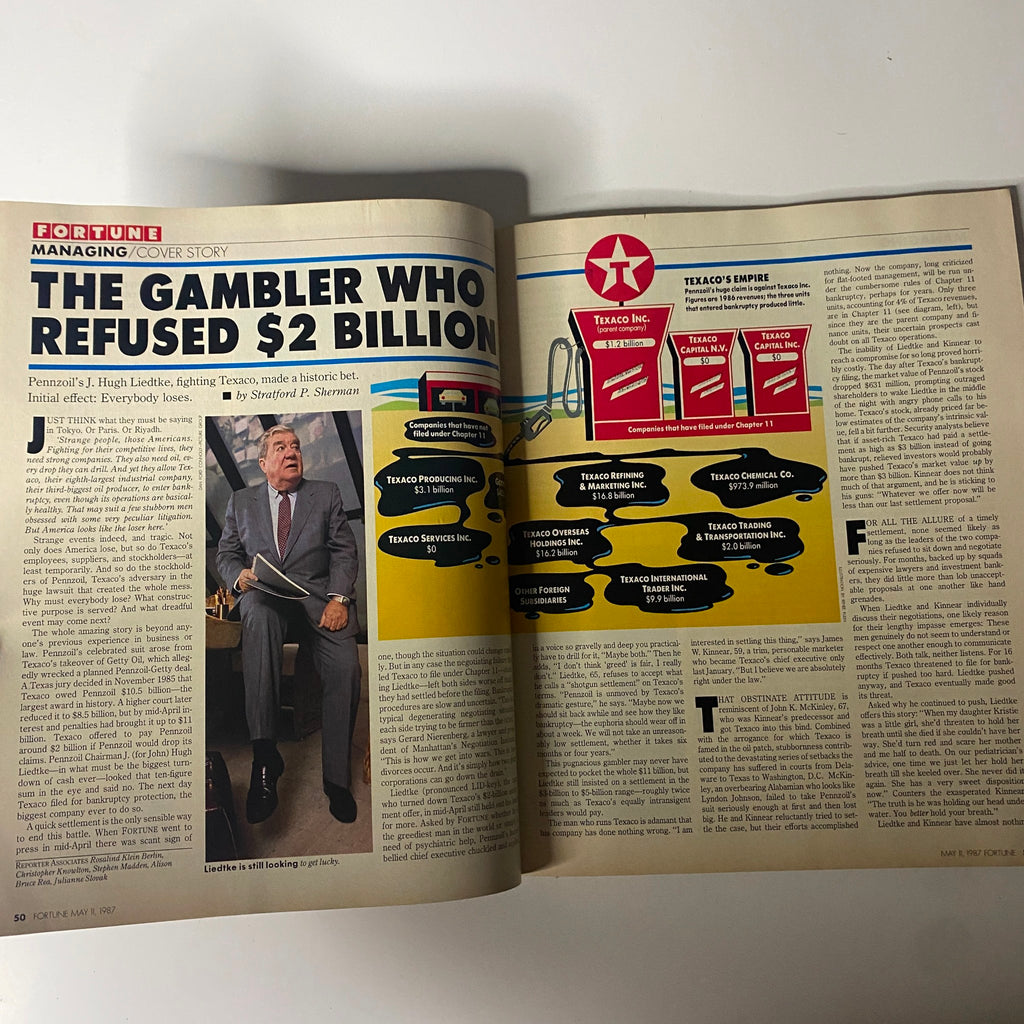 Experience a piece of history with this Fortune Magazine from May 11, 1985, featuring a captivating cover story on J. Hugh Liedtke, Chairman of Pennzoil. This vintage magazine provides unparalleled insight into the decisions of Liedtke that significantly impacted the oil industry during a pivotal time.