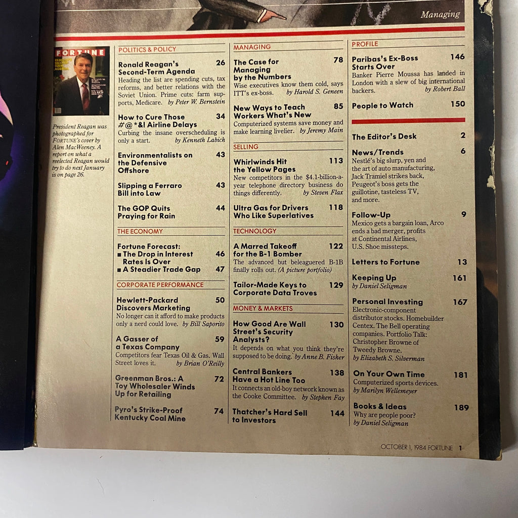 Explore a piece of history with this vintage edition of Fortune Magazine, dated October 1, 1984, featuring a comprehensive overview of Ronald Reagan's Second-Term Agenda. This magazine captures the economic landscape of the 1980s, delving into significant themes such as corporate performance, the advancing technology of the time, and the competitive airline industry, making it an essential collectible for enthusiasts and history buffs.