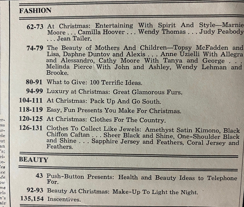 This particular issue is notable for its rich content, featuring several thematic articles that highlight the season's trends and inspirations. With titles like "At Christmas: Entertaining with Spirit and Style," and "Luxury at Christmas: Glamorous Furs," this magazine offers readers a luxurious glimpse into festive fashion, beauty tips, and gift ideas perfect for the holiday season. Furthermore, it includes insights such as "What to Give: 100 Terrific Ideas" and "Clothes to Collect Like Jewels: Satin Kimonos, Sheer Black, Sapphire Jersey, and Feathers," showcasing the splendid styles of the times.