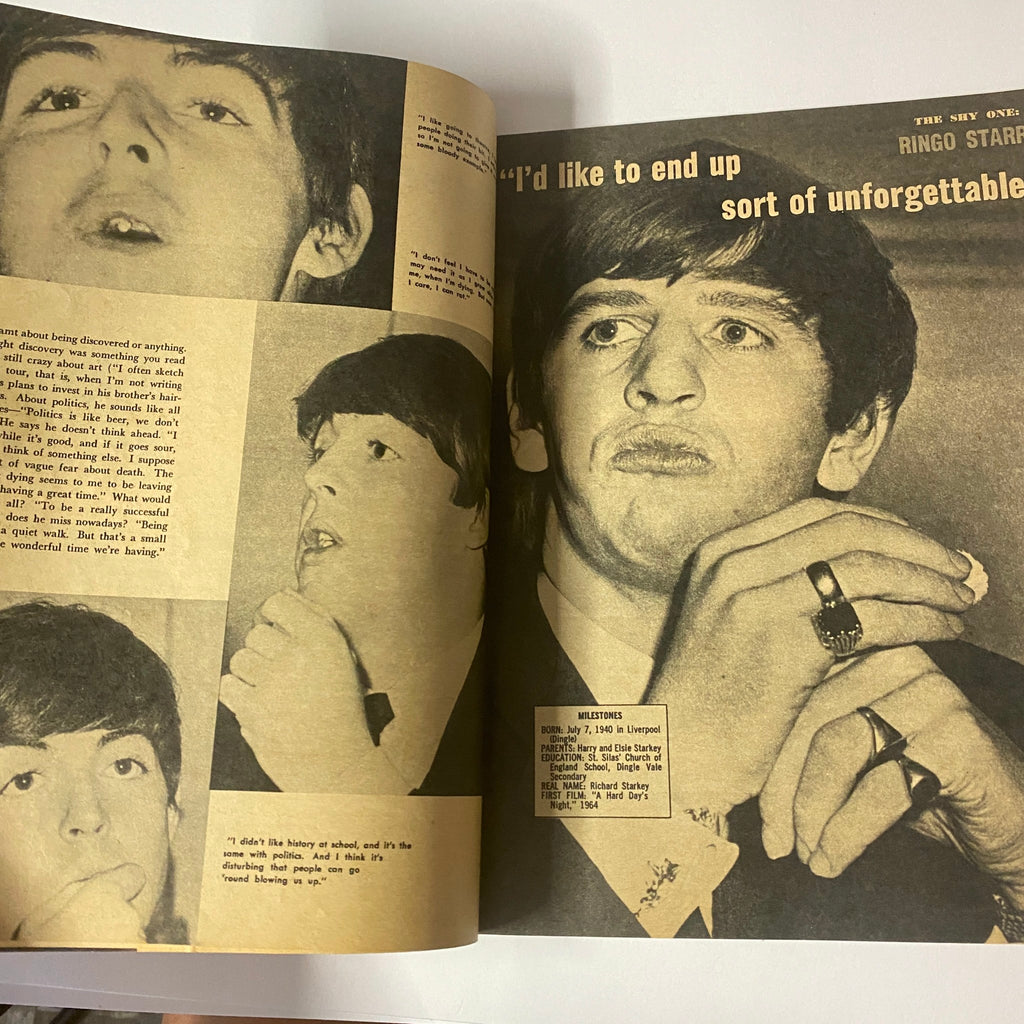 This 1964 issue of Hollywood Life Stories (No. 14) combines the glamour of Hollywood with the excitement of Beatlemania. Featuring a 14-page bonus section dedicated to the Beatles—complete with never-before-seen photos, individual life stories, and secrets revealed—this vintage magazine captures both the entertainment icons of the silver screen and the rising legends of rock and roll.