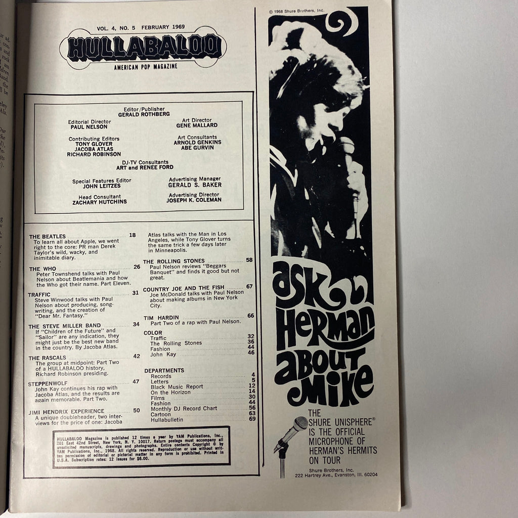 This February 1969 issue of Hullabaloo Magazine (Vol. 4, No. 5) is a standout from the late ’60s counterculture era, featuring John Lennon and Yoko Ono on the cover along with exclusive color posters and pin-ups. With deep coverage of The Beatles, The Who, Jimi Hendrix, The Rolling Stones, and more, this issue captures a defining moment in music history.