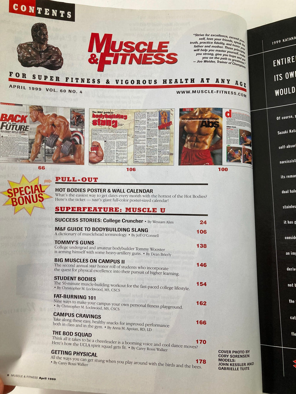 Discover a piece of fitness history with the Joe Weider's Muscle & Fitness Magazine from April 1999 featuring John Kessler and Gabrielle Tuite on the cover. This vintage issue of a renowned fitness publication captures the era of fitness enthusiasm that defined the 1990s, making it a valuable addition to any collection of vintage magazines.