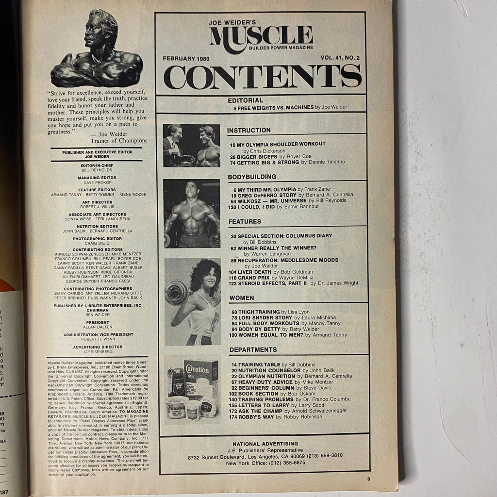 This vintage February 1980 issue of Joe Weider’s Muscle Magazine features Frank Zane and Christine on the cover (no mailing label). A highlight of bodybuilding’s golden age, this issue includes Olympia reflections, training instruction, nutrition advice, contest coverage, and features on some of the most influential athletes of the era.