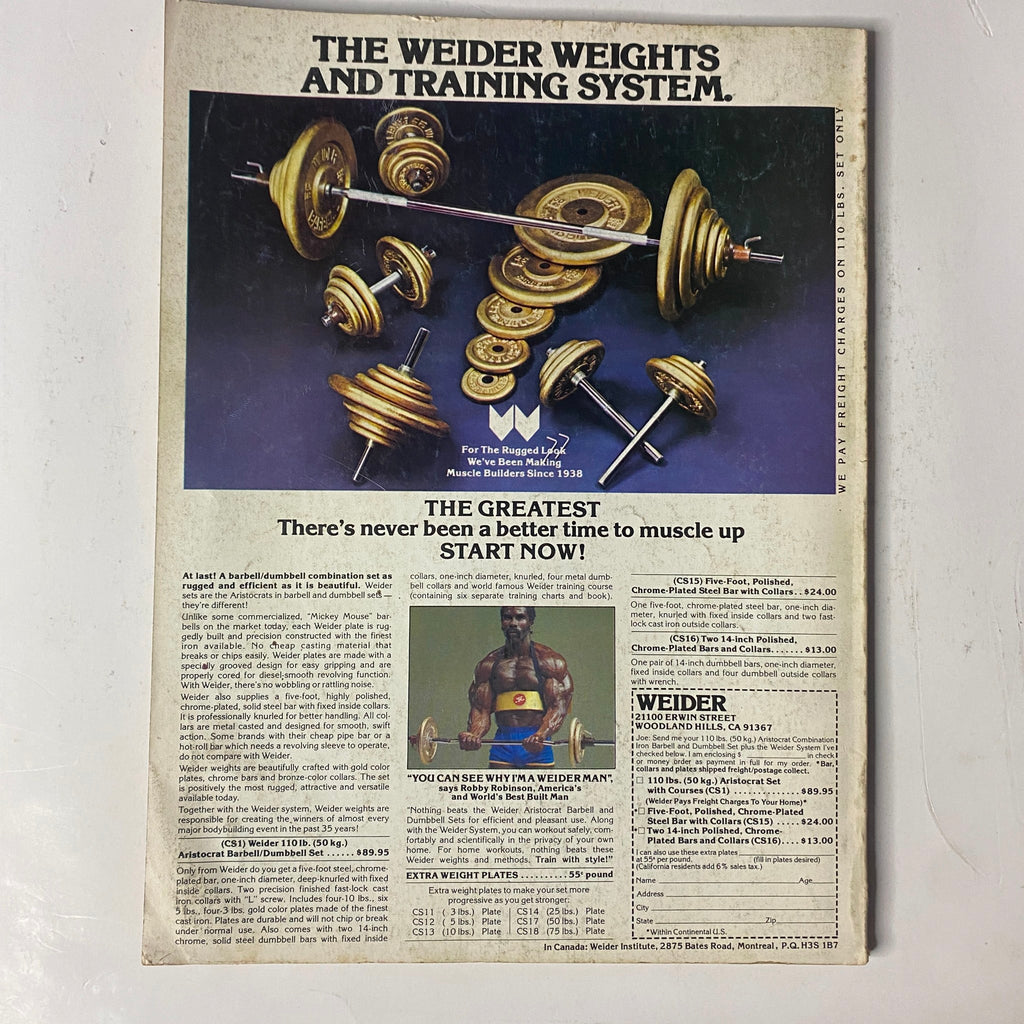 This issue features contributions from bodybuilding greats such as Arnold Schwarzenegger’s contemporaries Mike Mentzer, Franco Columbu, Boyer Coe, Steve Davis, Dennis Tinerino, and Robby Robinson, alongside legendary writers Joe Weider, Bill Pearl, and Betty Weider. A valuable collectible for bodybuilding fans and vintage magazine enthusiasts alike.