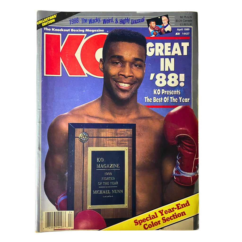 This April 1989 issue of KO Boxing Magazine features middleweight champion Michael Nunn on the cover and is presented without a mailing label. The magazine is in good condition, with all pages intact. Please review the listing photos for detailed condition reference. The exact item shown is the one you will receive.