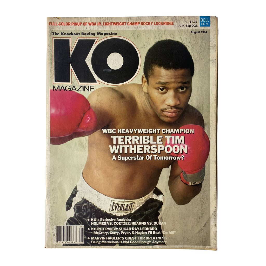 This August 1984 issue of KO Boxing Magazine features Tim Witherspoon, the newly crowned WBC heavyweight champion, on the cover with the headline: “A Superstar of Tomorrow?” Inside, the magazine dives deep into Witherspoon’s rise, Marvin Hagler’s pursuit of greatness, and exclusive previews of the June superfights featuring Larry Holmes vs. Gerrie Coetzee and Thomas Hearns vs. Roberto Duran. Also included is an exclusive interview with Sugar Ray Leonard, where he boldly claims he could beat McCrory, Curry, Pryor, and Hagler.