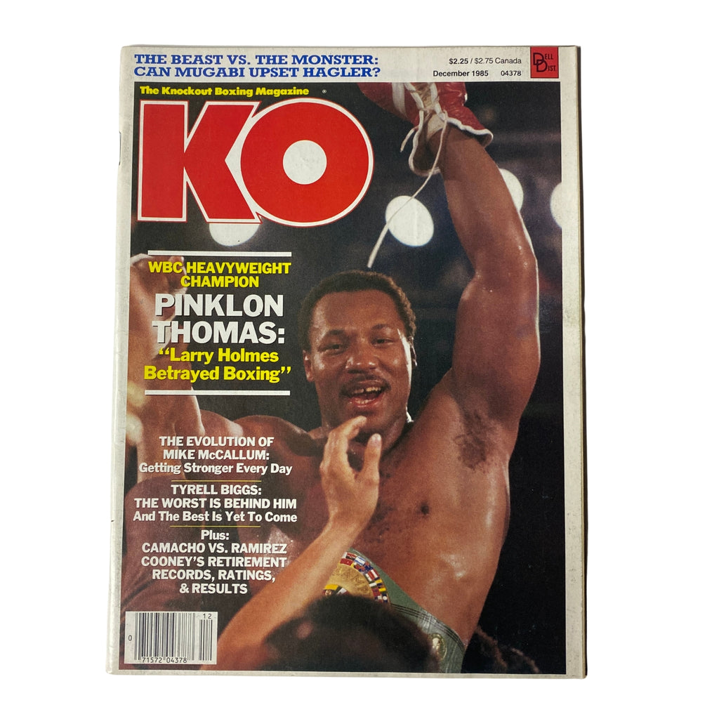 This December 1985 issue of KO Boxing Magazine features heavyweight champion Pinklon Thomas on the cover, as he discusses the state of boxing and offers his own strong views on the heavyweight division. With exclusive interviews, international coverage, and reports on fighters such as Julio César Chávez, Hector “Macho” Camacho, Mike McCallum, and Marvin Hagler, this issue captures a vibrant period in mid-1980s boxing.