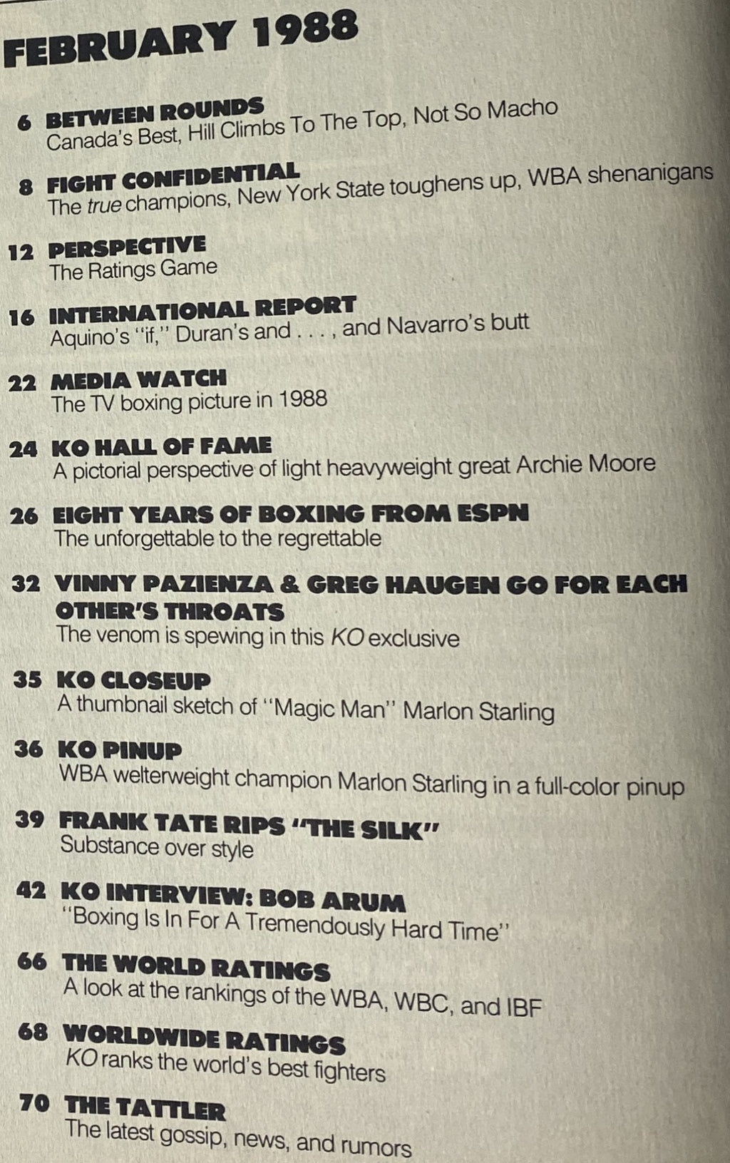 This February 1988 issue of KO Boxing Magazine spotlights Vinny Pazienza and Greg Haugen on the cover, highlighting their heated rivalry as they prepared to battle for lightweight supremacy. Packed with exclusive features, interviews, and international fight coverage, this issue also includes a special look at Archie Moore, Bob Arum’s candid thoughts on the state of boxing, and ESPN’s first eight years of televised fights.