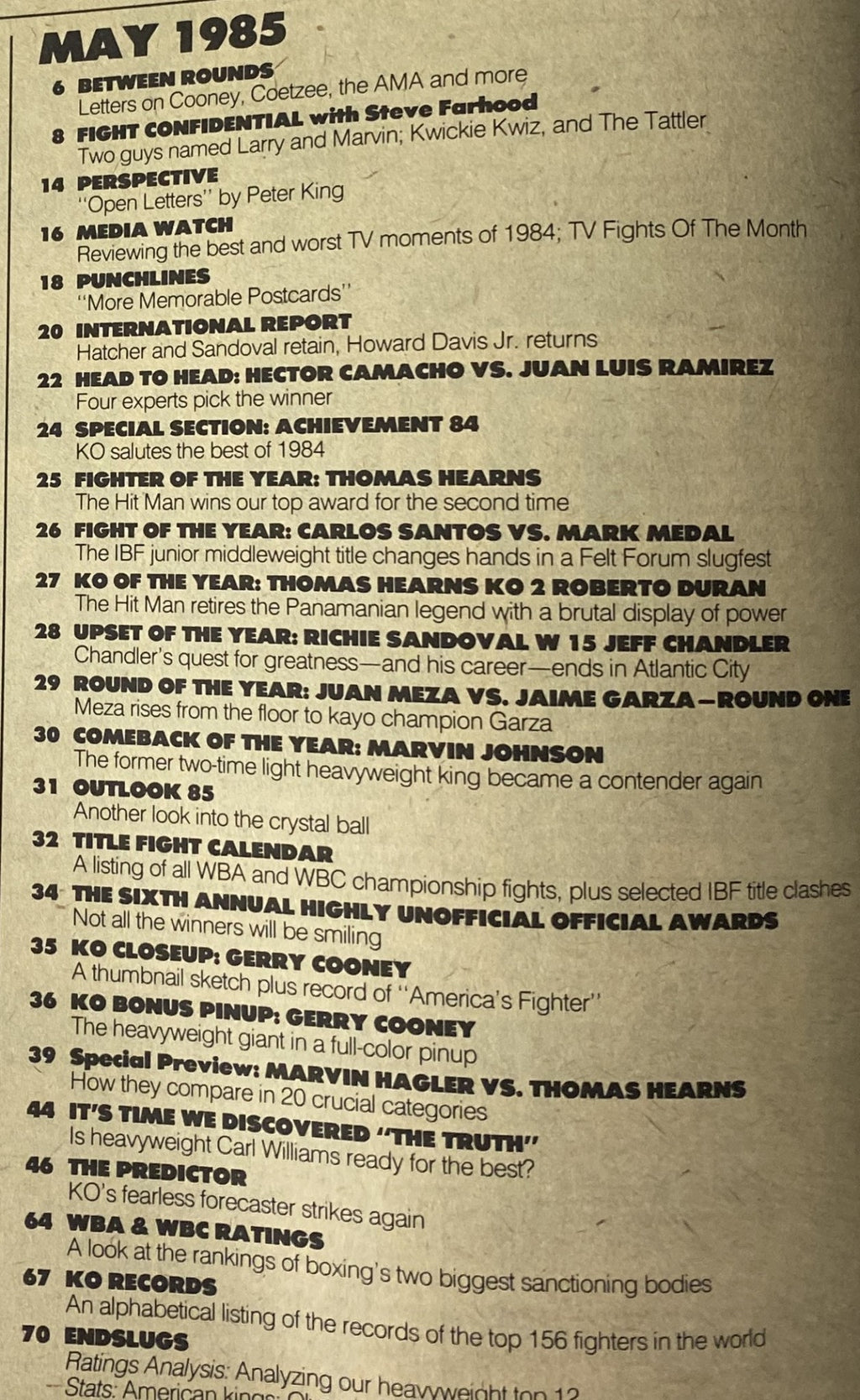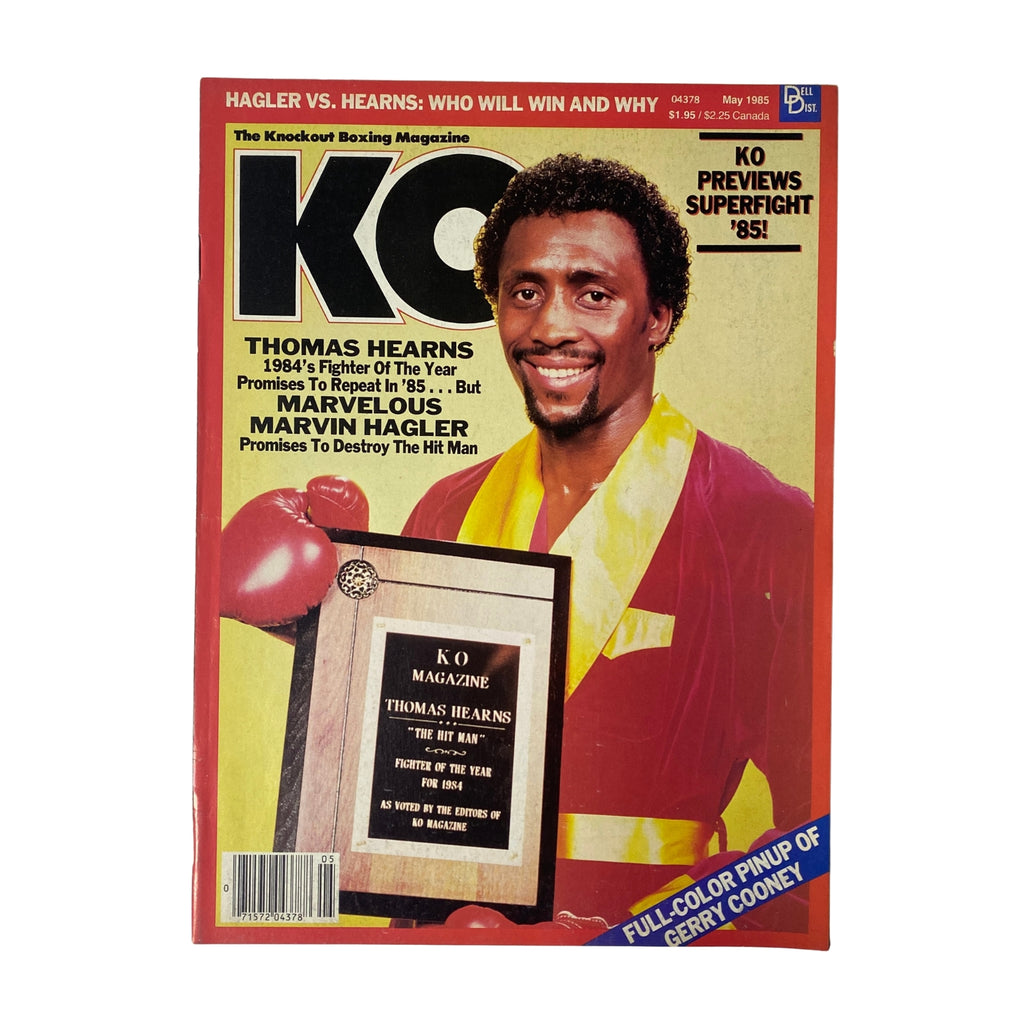 This May 1985 issue of KO Boxing Magazine showcases Thomas “The Hit Man” Hearns on the cover, highlighting his status as Fighter of the Year following his explosive victory over Roberto Duran. Packed with award features, previews, and insider coverage, this issue captures boxing at one of its most thrilling moments, with Hearns, Hagler, Cooney, and Camacho dominating headlines.