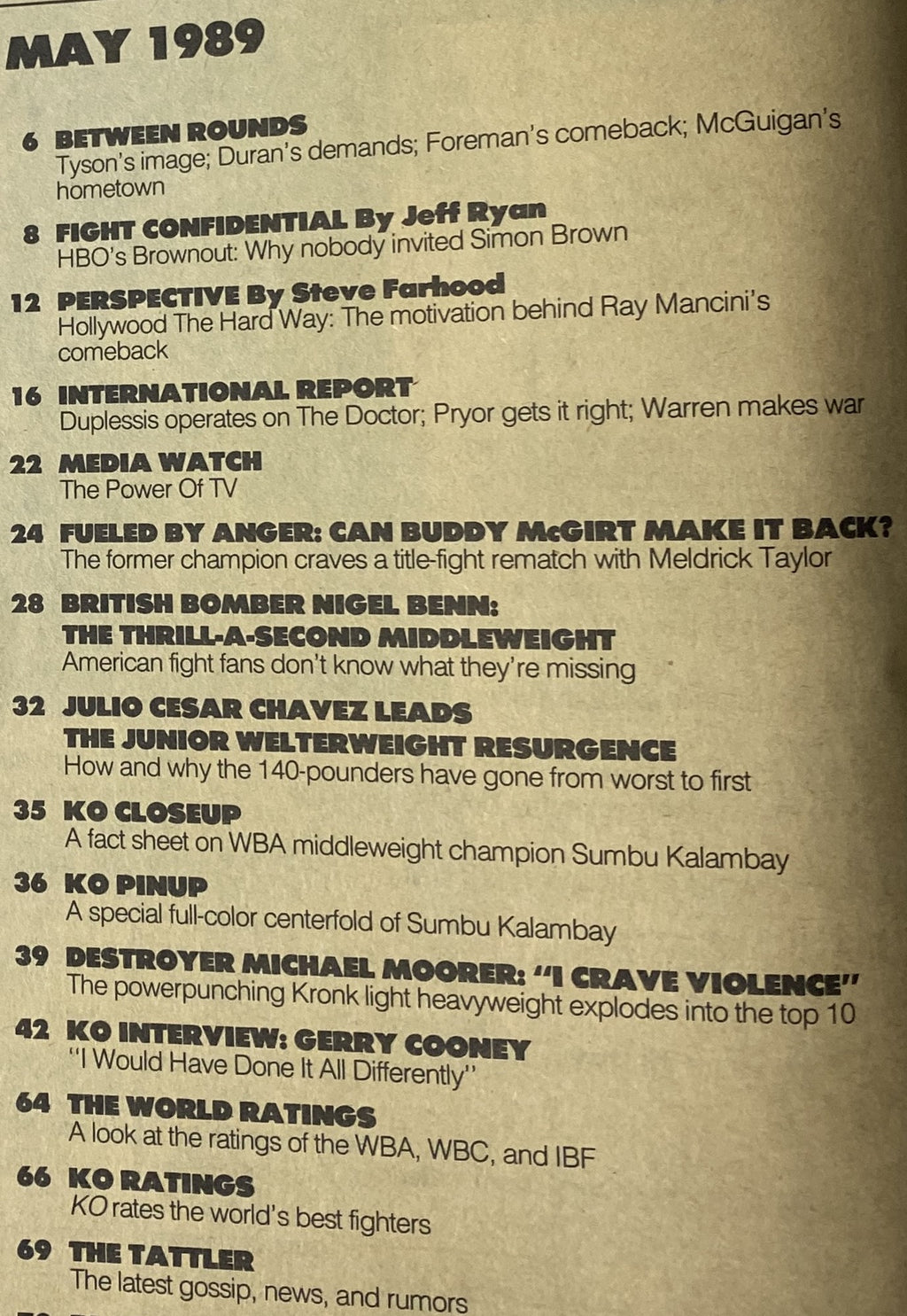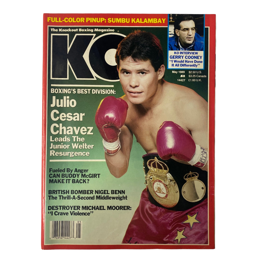 This May 1989 issue of KO Boxing Magazine features Julio César Chávez on the cover, spotlighting his dominance at junior welterweight and the division’s dramatic resurgence. With in-depth coverage of Chávez, Nigel Benn, Buddy McGirt, and Michael Moorer, as well as interviews and features on legends like Gerry Cooney, this issue captures the excitement of late-80s boxing.
