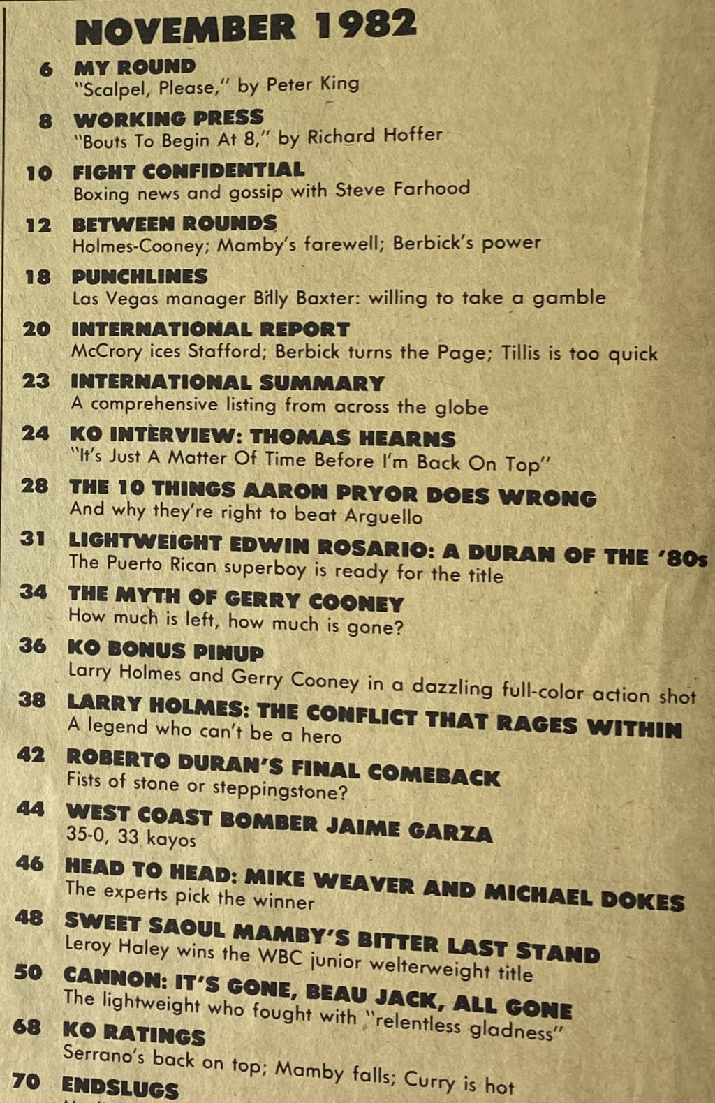 This November 1982 issue of KO Boxing Magazine features heavyweight contender Gerry Cooney on the cover, just months after his legendary showdown with Larry Holmes. Inside, readers will find a mix of hard-hitting interviews, fight previews, international reports, and in-depth profiles of some of the most prominent fighters of the early 1980s.