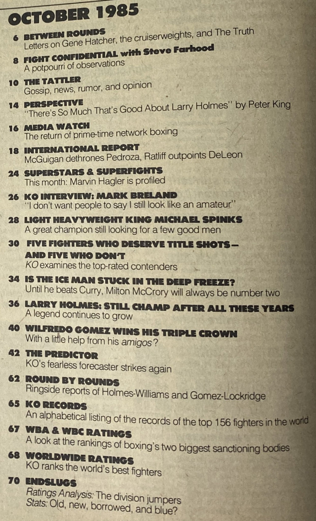 This issue is a must-have for boxing collectors and historians, especially those following Larry Holmes’ championship reign and the rise of fighters like Breland, McGuigan, and Spinks. With its balanced mix of analysis, interviews, and fight coverage, it offers a vivid snapshot of mid-1980s boxing.