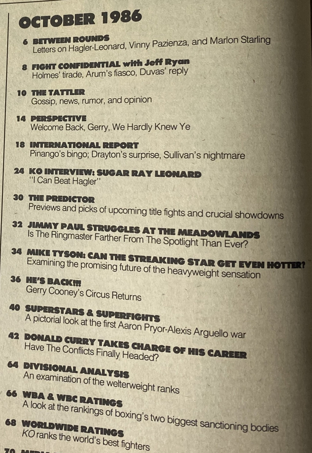 This October 1986 issue of KO Boxing Magazine features Gerry “Circus” Cooney on the cover, spotlighting his much-publicized return to the ring. Alongside Cooney’s comeback, the issue captures the excitement of boxing’s mid-1980s landscape with features on Sugar Ray Leonard, Mike Tyson, Donald Curry, and in-depth analysis of the welterweight division.