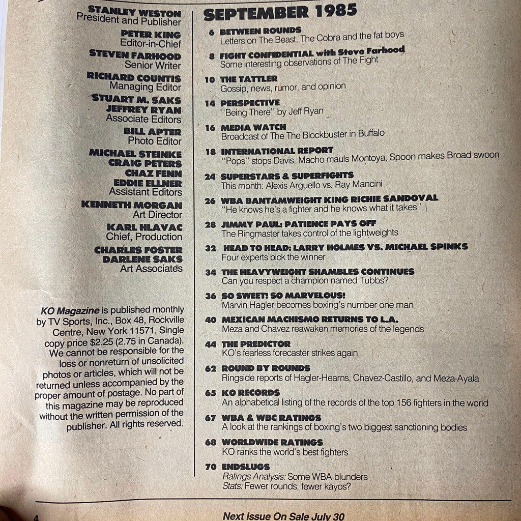 KO Boxing Magazine – September 1985 – Marvin Hagler Cover (No Label)
