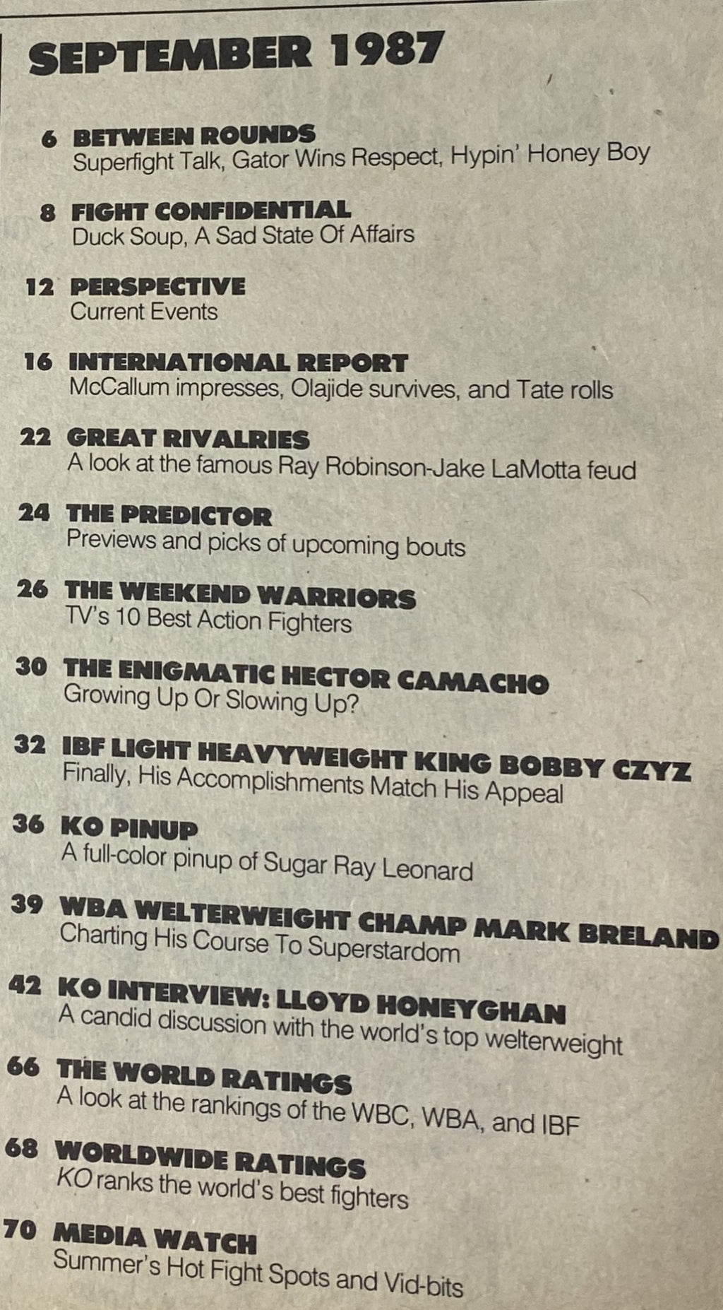 This September 1987 issue of KO Boxing Magazine features IBF light heavyweight champion Bobby Czyz alongside Jim McDonald on the cover. Inside, the magazine dives into Czyz’s rise, the future of Mark Breland, and an in-depth interview with Lloyd Honeyghan, one of the sport’s top welterweights of the era.