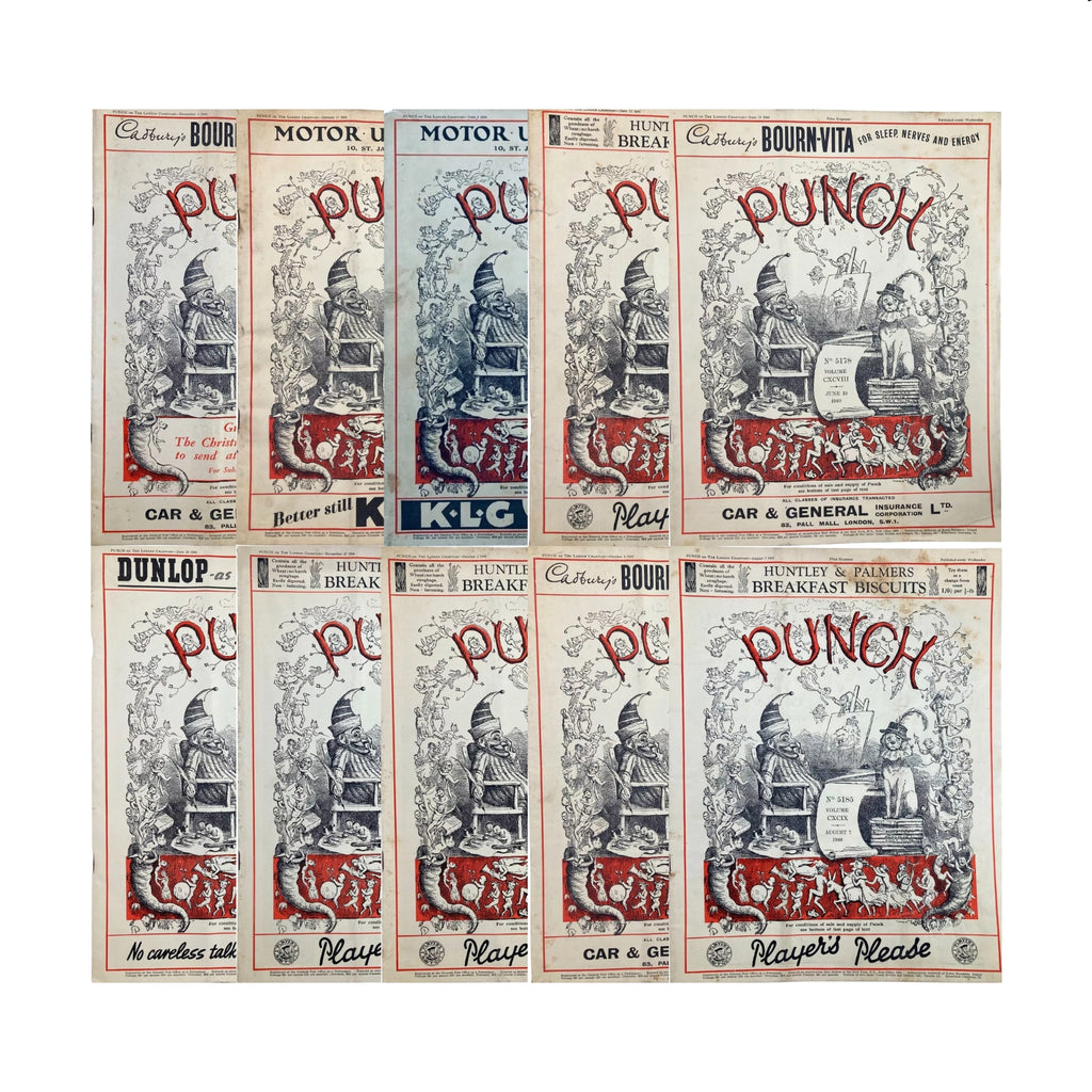 This listing features a coveted collection of 10 vintage magazines from the iconic British publication, Punch, dating back to 1940. These issues are rich in historical significance, capturing the unique blend of humor and political commentary prevalent during World War II. Renowned for its sharp satire, Punch was a crucial platform for British perspectives during a time of unrest, making these vintage magazines not just collections items, but pieces of history.
