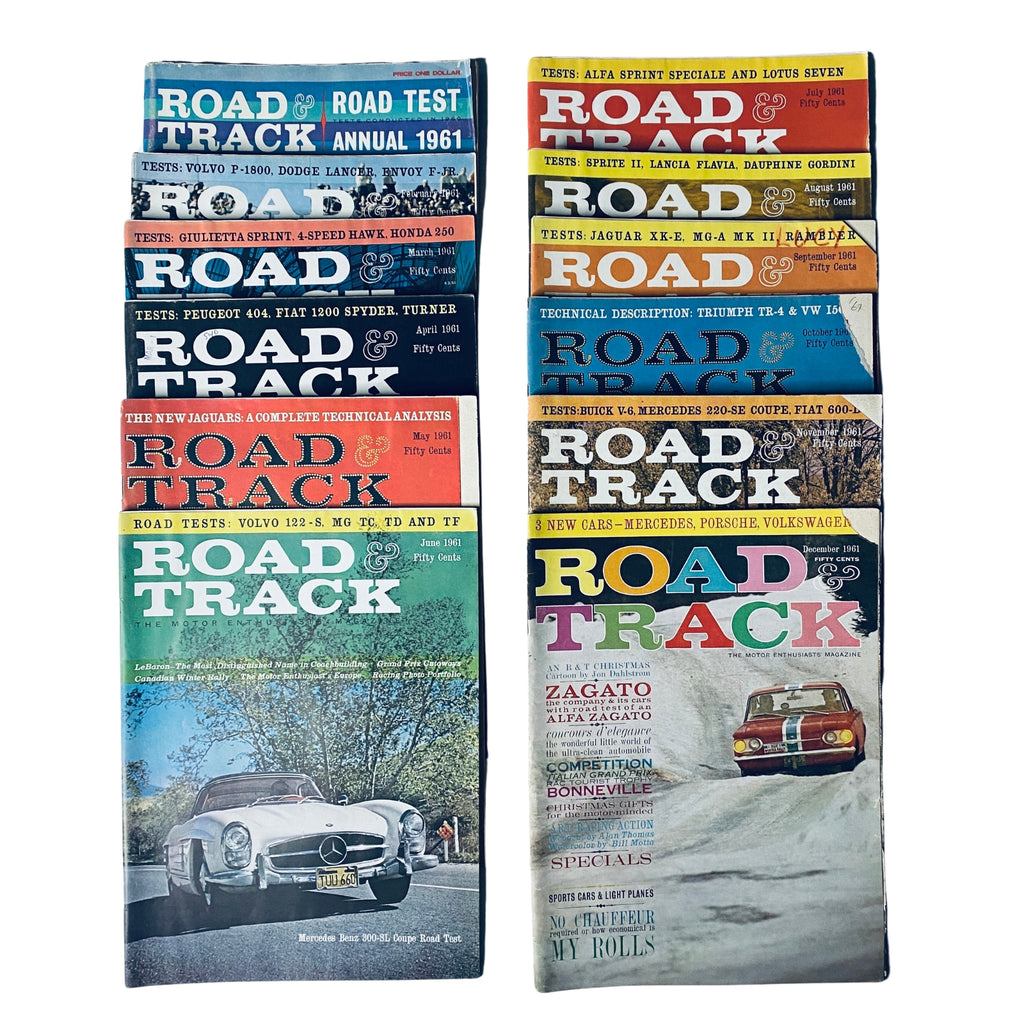 This is a near-complete year set of Road & Track magazines from 1961, missing only the January issue but including the sought-after 1961 Road Test Annual. A fantastic collection for vintage auto enthusiasts, featuring race coverage, road tests, and classic automotive reporting from the golden era of motoring.