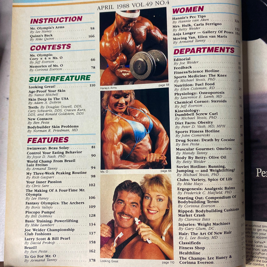 This vintage April 1988 issue of Muscle & Fitness features Joe Piscopo and Kimberly Driscoll on the cover. The magazine is in very good condition, showing only minor wear on the edges. This item is in excellent shape for its age. The item pictured is the exact copy you will receive. Please review the photos for condition purposes.