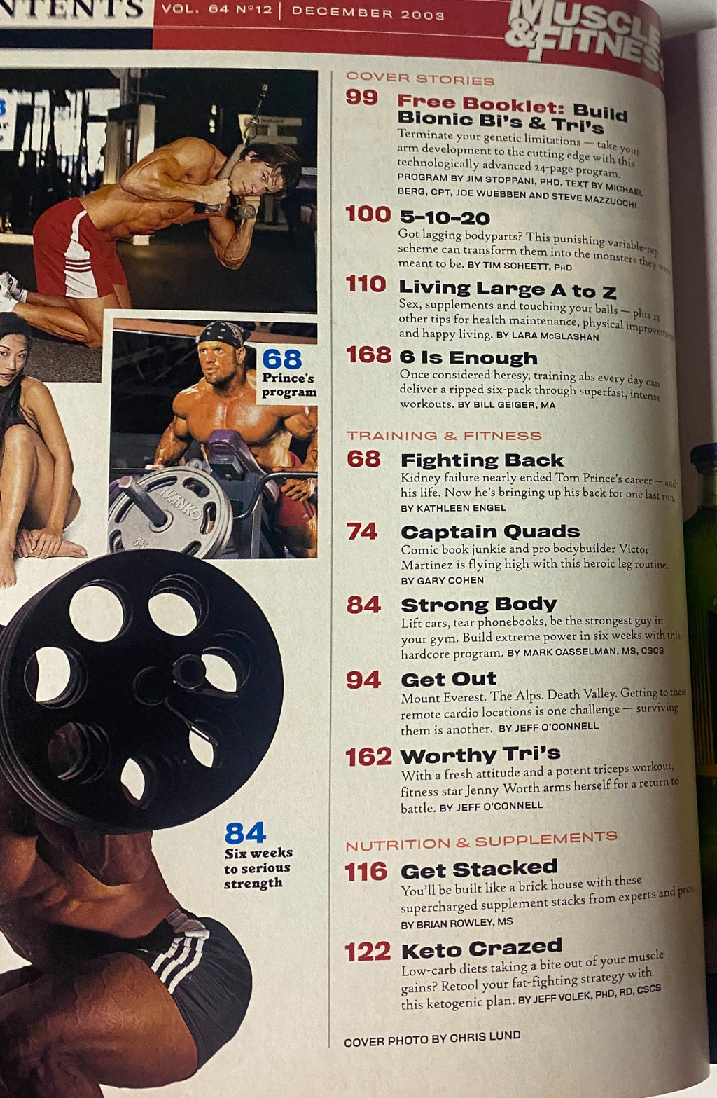 This vintage issue of Muscle & Fitness Magazine (December 2003, Vol. 64, No. 12) features Jay Cutler on the cover. This is a quantity item, meaning multiple copies are available, each in very good condition with only minor edge wear. The copy pictured is the exact item you will receive. Please review all photos carefully for condition purposes.