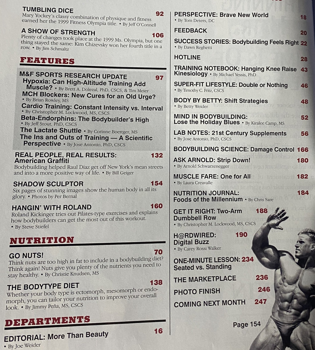 Departments: Editorials by Joe Weider and Tom Deters, Betty Weider’s Body by Betty, Arnold Schwarzenegger’s Ask Arnold column, Laura Creavalle’s Muscle Fare, Chris Sare’s Nutrition Journal, and training insights from Michael Yessis and Jose Antonio.