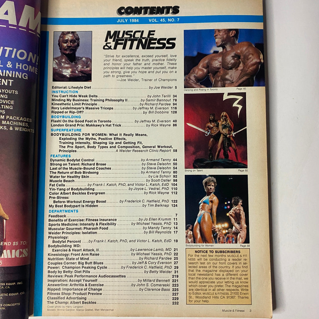 This July 1984 issue of Muscle & Fitness features Matt Mendenhall alongside Vince Macica and Marcia Goebel on the cover, photographed by Harry Langdon. The magazine captures the evolving bodybuilding landscape of the mid-1980s with a mix of contest reports, advanced training instruction, features on skin, nutrition, and psychology, as well as a landmark superfeature on women’s bodybuilding.