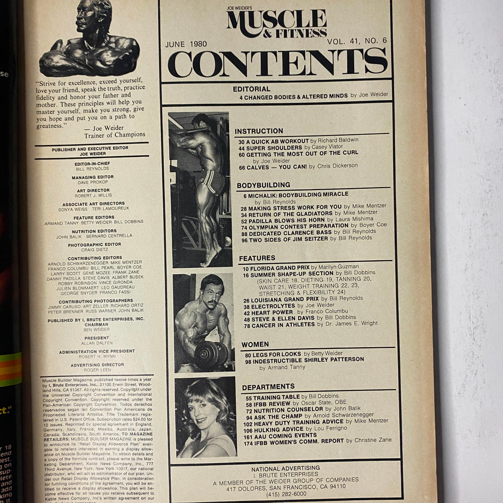 This vintage June 1980 issue of Muscle & Fitness Magazine features Casey Viator on the cover and includes the original poster (no mailing label). It offers a wide range of training routines, contest highlights, nutrition advice, and bodybuilding insights from many of the sport’s most influential figures of the era.