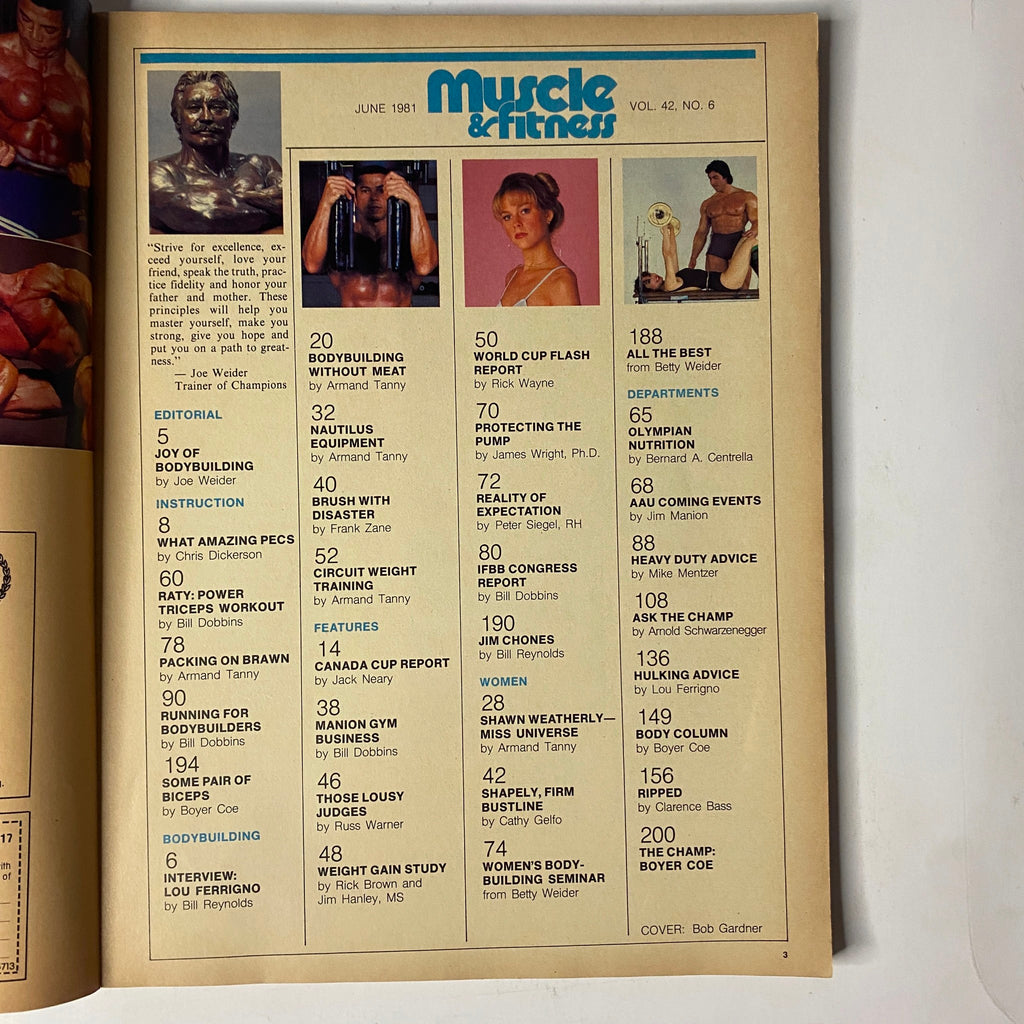 This June 1981 issue of Muscle & Fitness features Dennis Tinerino alongside Shawn Weatherly, Miss Universe 1980, on the cover. Inside, the issue delivers a rich variety of bodybuilding training articles, nutrition insights, and competition coverage, with features from top champions and experts including Arnold Schwarzenegger, Lou Ferrigno, Mike Mentzer, Boyer Coe, and Frank Zane.