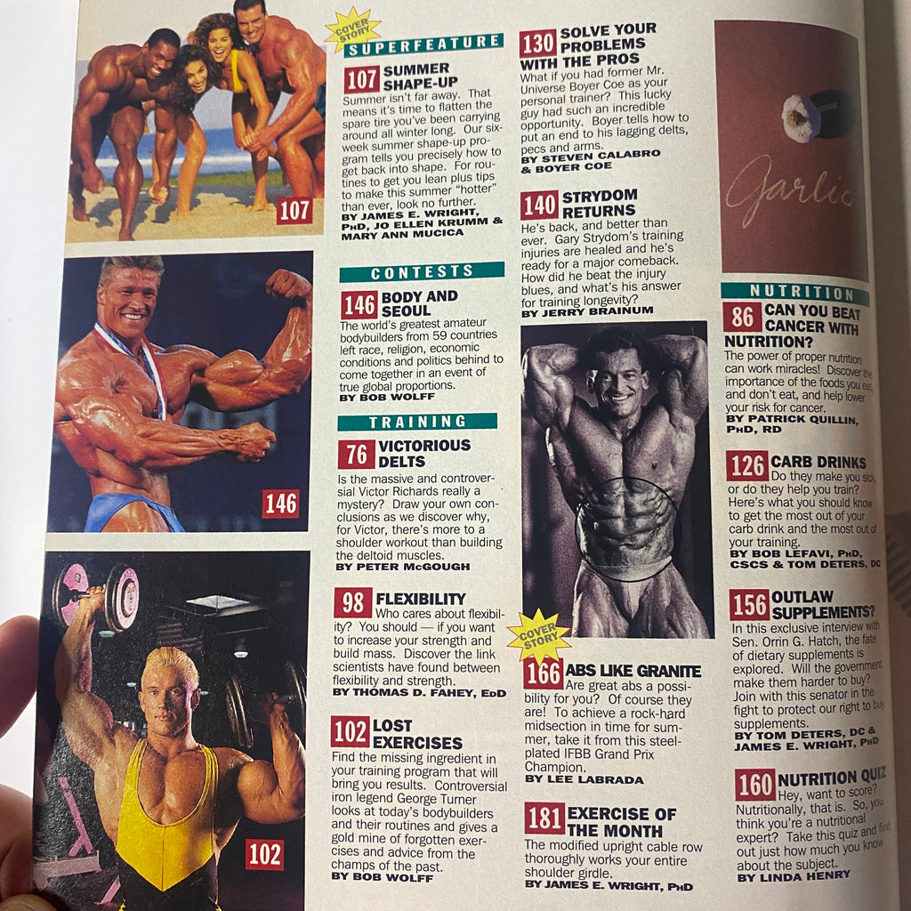 This issue delivers a strong mix of training science, contest coverage, and nutritional strategies, highlighted by the 5th Annual Muscle-Up Guide and contributions from bodybuilding icons such as Victor Richards, Gary Strydom, and Lee Labrada.