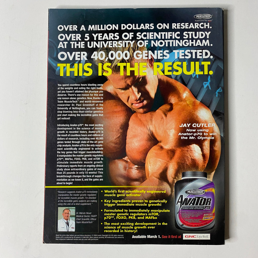 This March 2006 issue of Muscle & Fitness features James Romagna on the cover, with a strong focus on nutrition, training, and the future of bodybuilding stars like Phil Heath. The magazine is in very good condition, with only minor edge wear. The exact copy shown is the one you will receive, and it comes in a protective plastic covering. Please review photos for condition details.