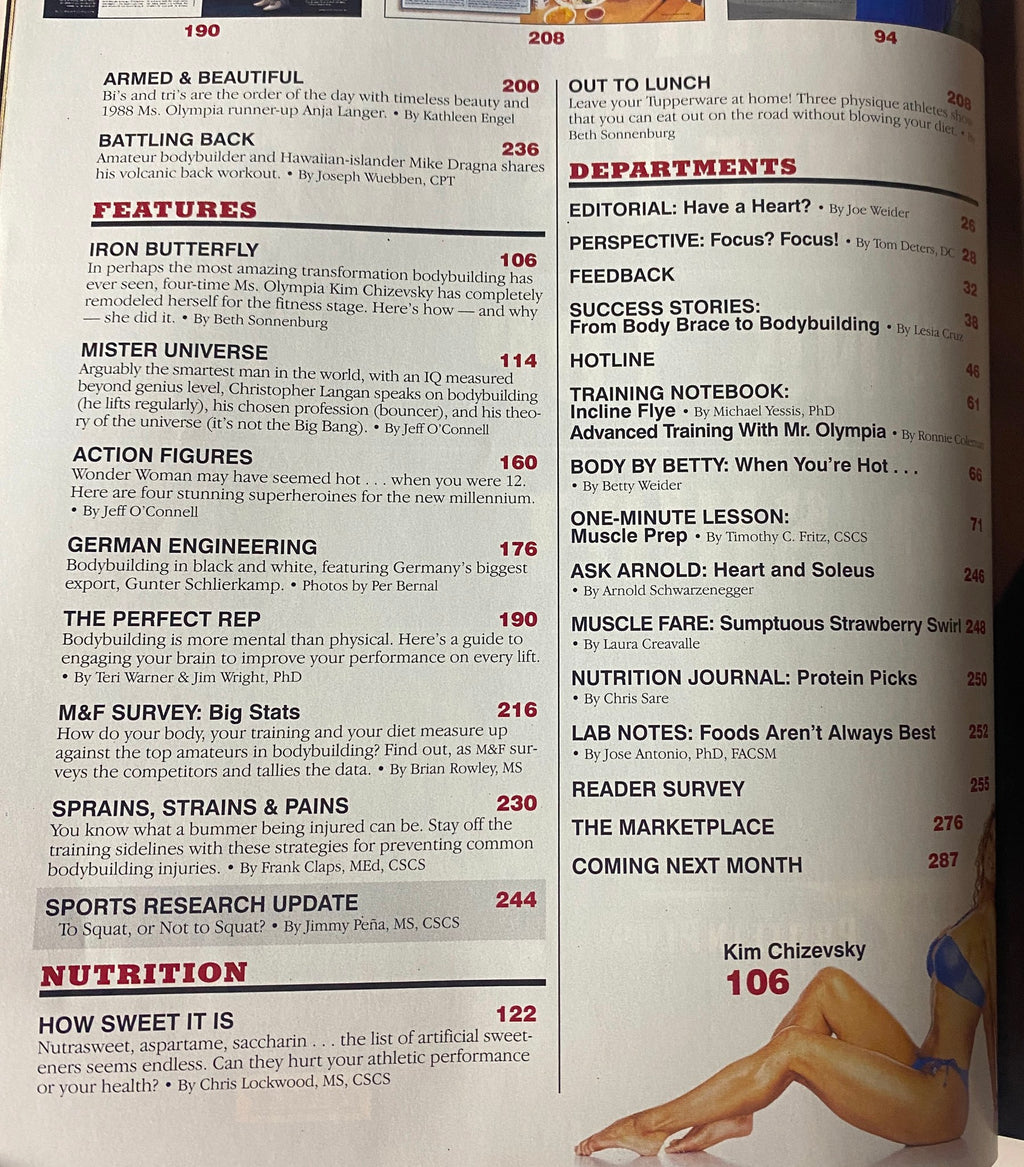 This vintage issue of Muscle & Fitness Magazine (May 2001) features an in-depth profile of four-time Ms. Olympia Kim Chizevsky as she transitions from bodybuilding to the fitness stage. This is a quantity item, meaning multiple copies are available, each in very good condition with only minor edge wear. The copy pictured is the exact item you will receive. Please review all photos carefully for condition purposes.