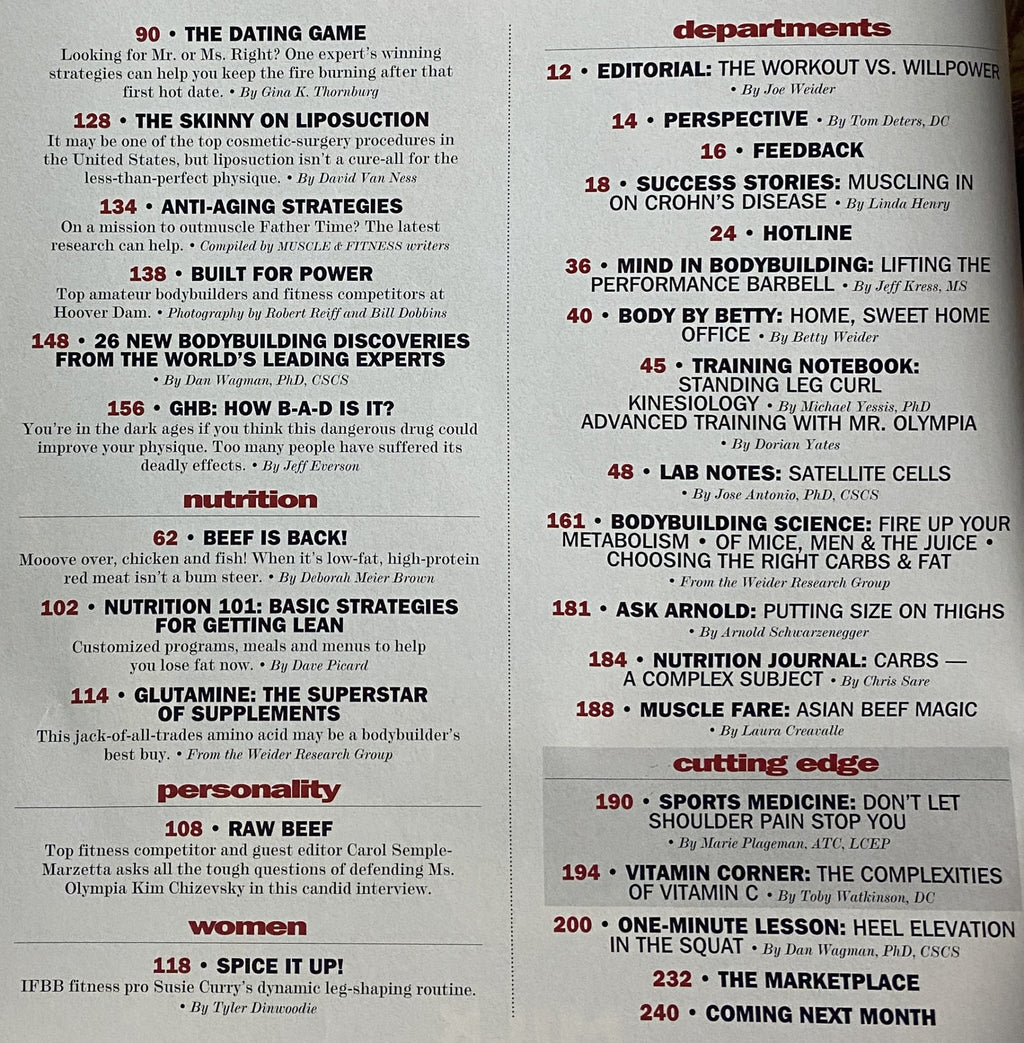 Departments: Joe Weider editorial, training science from Dorian Yates and others, Arnold Schwarzenegger’s advice on thigh size, and Laura Creavalle’s Muscle Fare recipes.