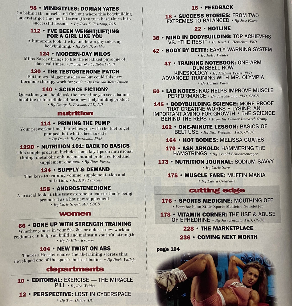 Features: A candid look at Dorian Yates’ mindset, a humorous essay on bodybuilding culture, and “Modern-Day Milos” showcasing Sarcev’s physique.