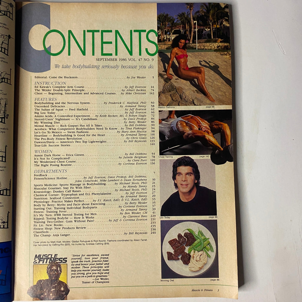 This vintage issue of Muscle & Fitness Magazine from September 1986 features Gladys Portugues and Rod Koontz on the cover, photographed by Matti Klatt, with fashions coordinated by Alison Farrell (her two-piece by D’Airfio-Rio, his trunks by Andreas Cahling). The magazine is in good condition and comes without a mailing label. The exact copy shown in the photos is the one you will receive. Please review pictures carefully to assess overall condition.