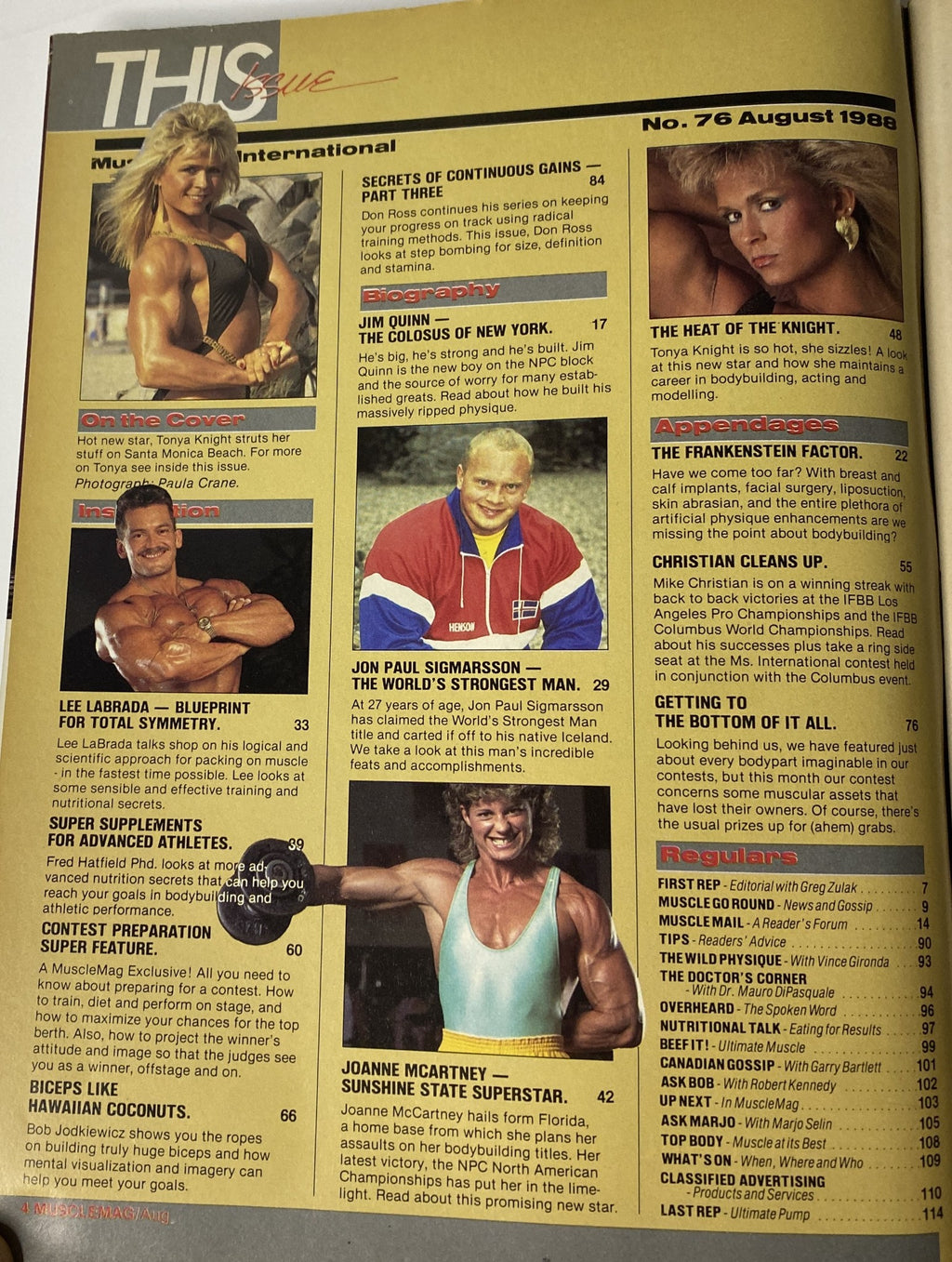 This issue captures a golden moment in bodybuilding history, with Tonya Knight, Lee Labrada, Jim Quinn, Jon Paul Sigmarsson, Joanne McCartney, Mike Christian, Don Ross, and Fred Hatfield all featured. A prime collectible for bodybuilding enthusiasts and vintage fitness magazine collectors.