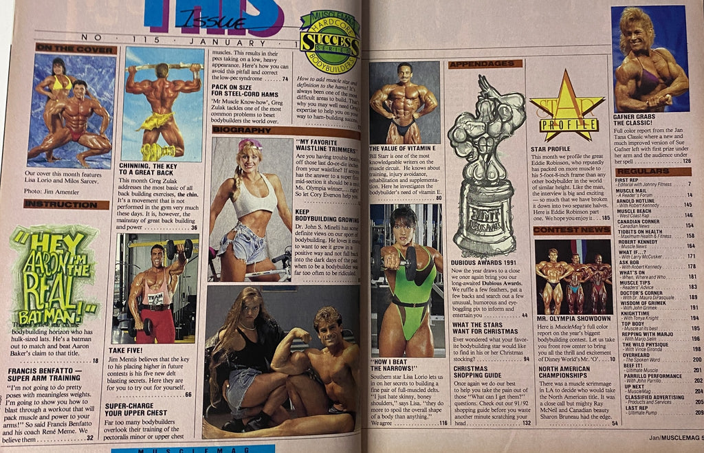 This vintage MuscleMag International issue from January 1992 features Milos Sarcev and Lisa Lorio on the cover. Packed with contest reports, expert training articles, supplement advice, and holiday features, this edition captures the energy of bodybuilding in the early 1990s.