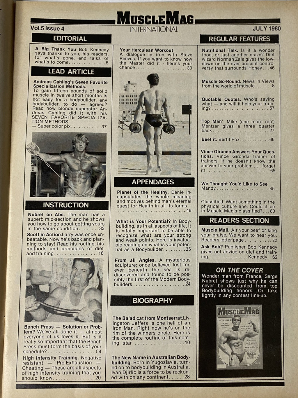 This vintage July 1980 issue of MuscleMag International features Serge Nubret, the legendary French bodybuilder known for his incredible physique and symmetry. Packed with expert instruction, exclusive interviews, and bodybuilding culture from the golden era, this issue highlights Nubret’s ab training, Andreas Cahling’s specialization methods, and a dialogue in iron with Steve Reeves. A collectible must-have for bodybuilding enthusiasts and vintage magazine collectors.