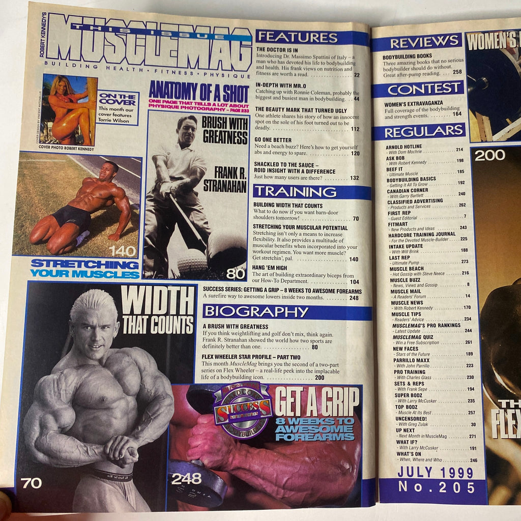This vintage issue of MuscleMag International (July 1999, No. 205) features Torrie Wilson on the cover during her rise as a fitness model and future wrestling star. Inside, the issue provides a mix of bodybuilding training routines, nutrition strategies, industry gossip, and features on rising athletes. With contributions from Robert Kennedy, Don Mochrie, Charles Glass, John Parrillo, Frank Sepe, and other respected voices, this edition captures the vibrant fitness culture of the late 1990s.