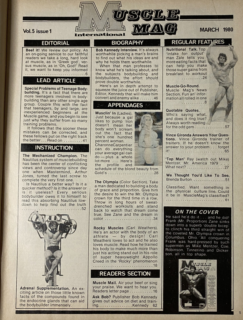 This vintage March 1980 issue of MuscleMag International features Frank Zane, fresh from his third consecutive Mr. Olympia victory, along with an array of bodybuilding articles, interviews, and features from the peak of the sport’s golden era. With instruction on the Nautilus system, teenage bodybuilding guidance, and celebrity training insights, this issue blends practical knowledge with unique cultural snapshots of the time. A standout collectible for bodybuilding enthusiasts and vintage magazine collectors.