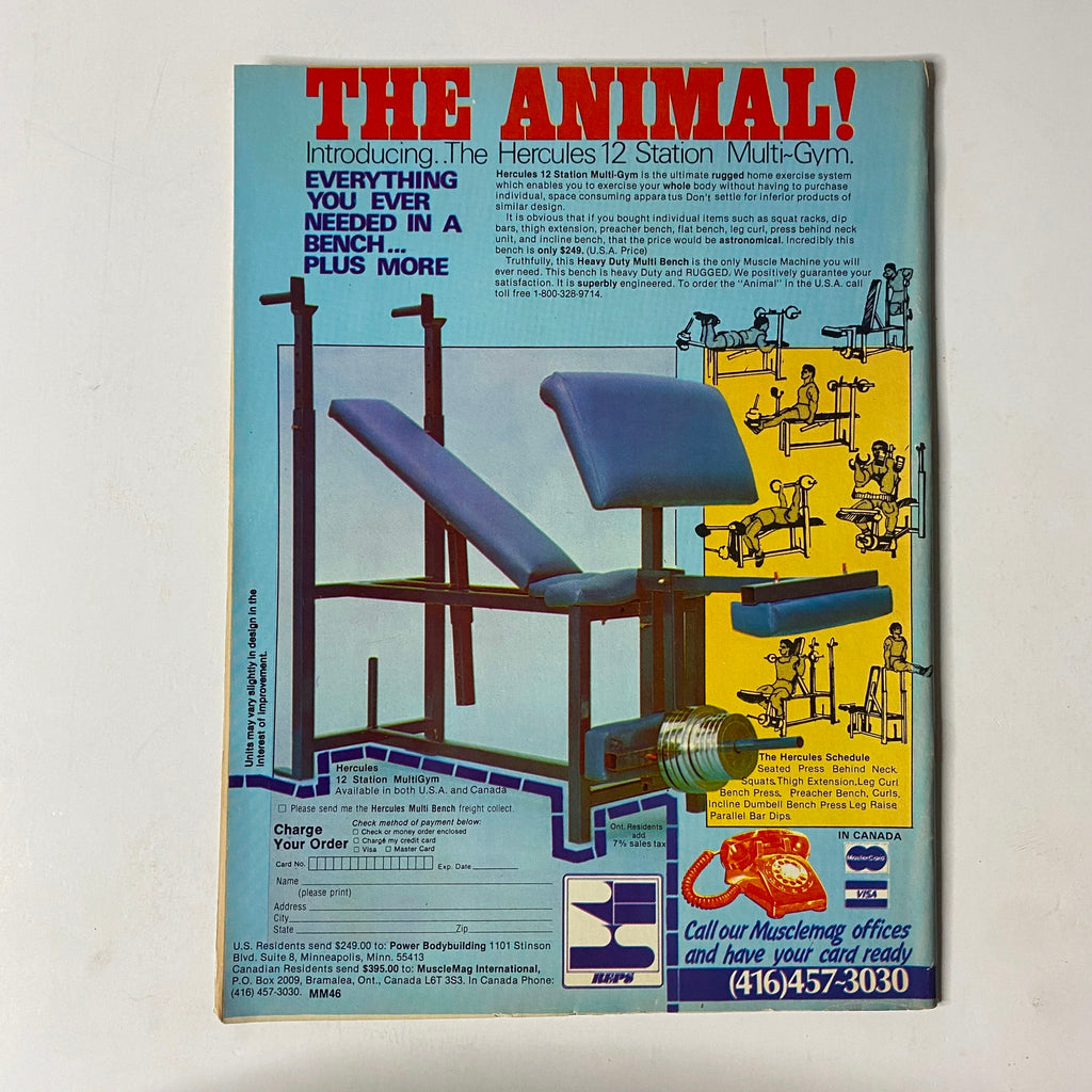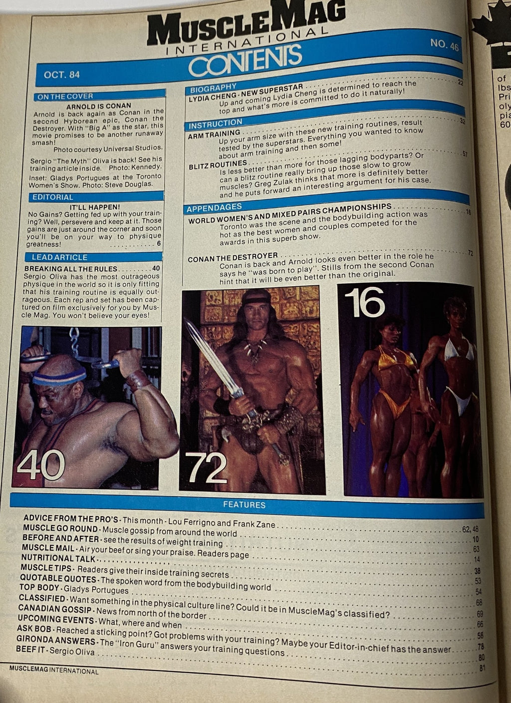 This vintage issue of MuscleMag International (October 1984, No. 46) features two bodybuilding legends at the forefront: Arnold Schwarzenegger, returning to the screen in Conan the Destroyer, and Sergio “The Myth” Oliva, whose outrageous physique and equally outrageous training style are showcased inside. Also featured are Gladys Portugues, Lydia Cheng, and contest coverage from the World Women’s and Mixed Pairs Championships. Packed with exclusive training articles, biographies, and industry insight, this issue is a snapshot of bodybuilding’s golden era.