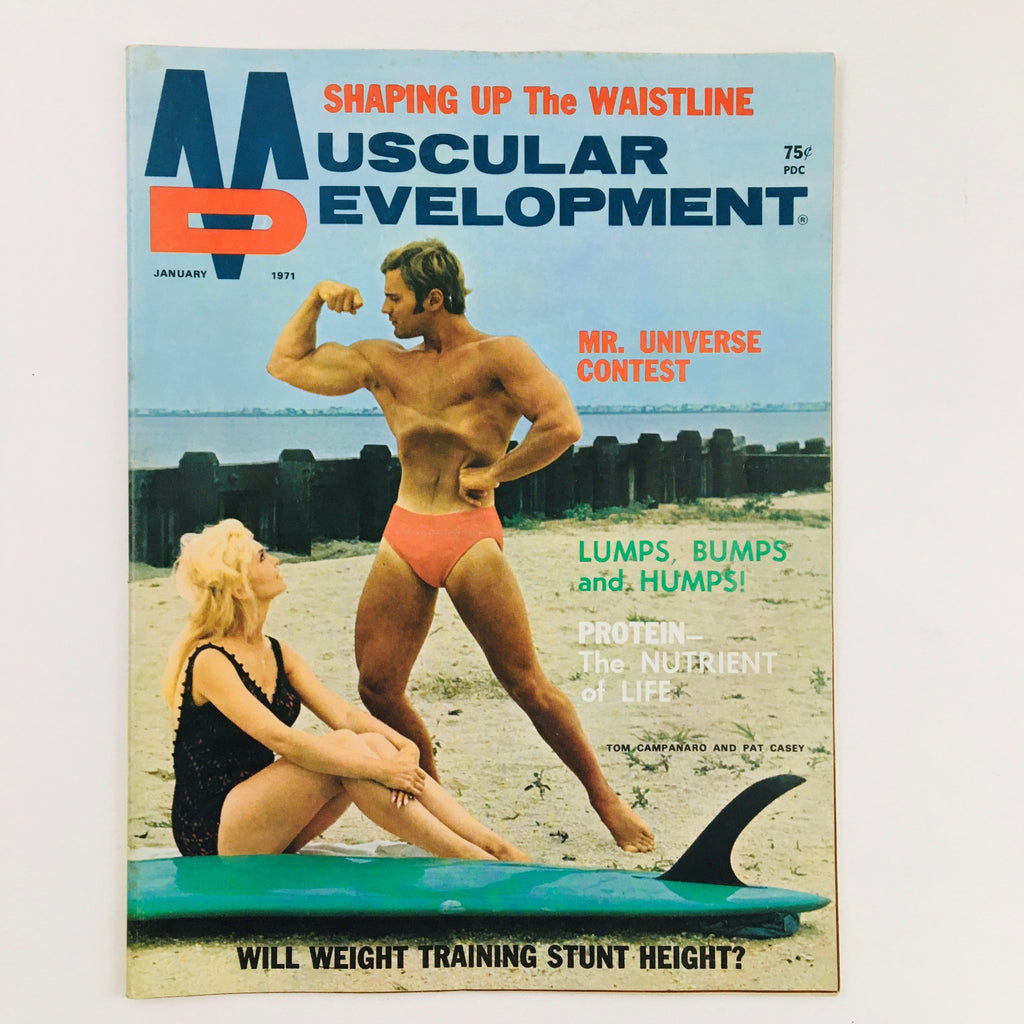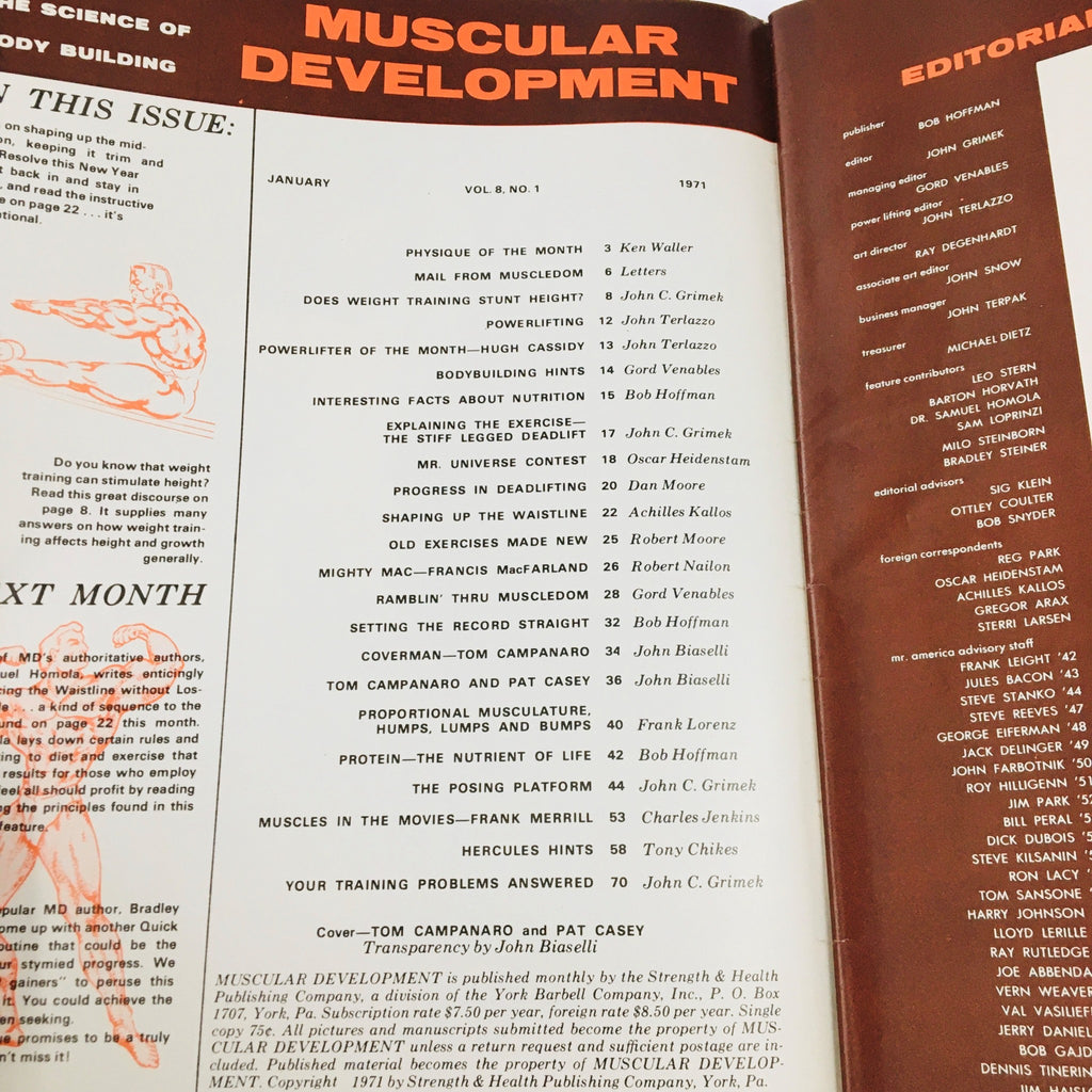 Step back in time with the Muscular Development Magazine, January 1971, featuring the legendary athletes Tom Capanaro and Pat Casey. This vintage issue is a fantastic piece for collectors or anyone passionate about bodybuilding and fitness history.