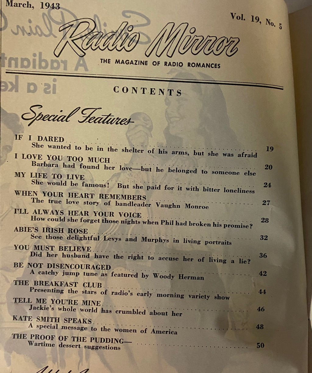 This March 1943 issue of Radio Mirror features Patricia Ryan on the cover, offering readers an engaging mix of romantic fiction, radio program profiles, and home-front lifestyle articles from the World War II era. A wonderful example of early 1940s entertainment journalism, this magazine reflects the warmth and resilience of its time.
